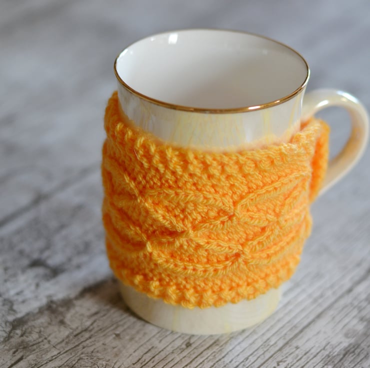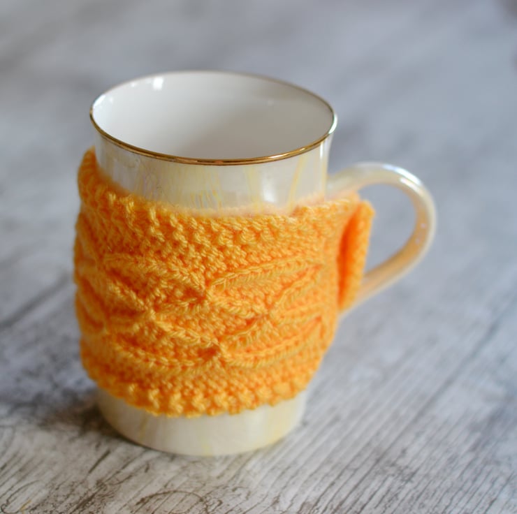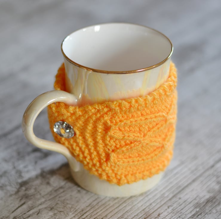 New design limited edition. Made in 100% acrylic in a lovely orangey yellow shade. Fits only slim tall mugs of cups with a diameter of 3" across the width of the cup. Fastens with a pretty clear faceted crystal button.