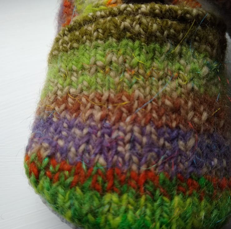 Soft indoor shoes handmade from my own handspun yarn, knitted and slightly felted, making each pair different