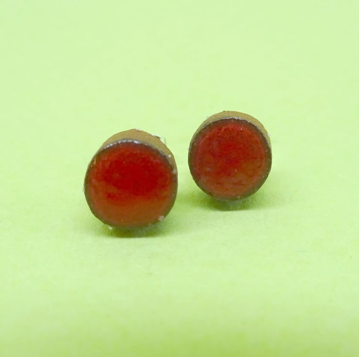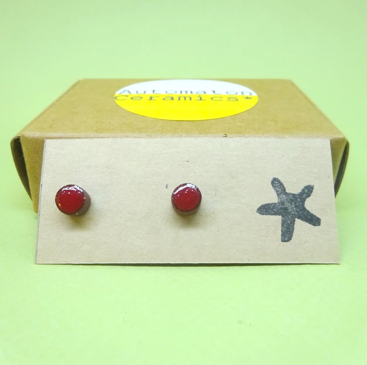 These small terracotta ceramic ear studs are made from a sanded Etruscan clay, each one is individually cut out and shaped and then painted with slips. They are fired once then hand painted with a glaze, this final firing brings out the deep purple brown of the clay and bright jewel like colours of the glaze. Each pair has a rustic hand made finish. They have silver plated studs securely glued to the back.