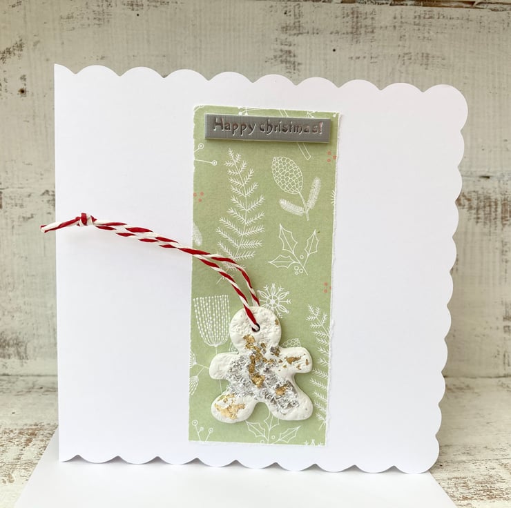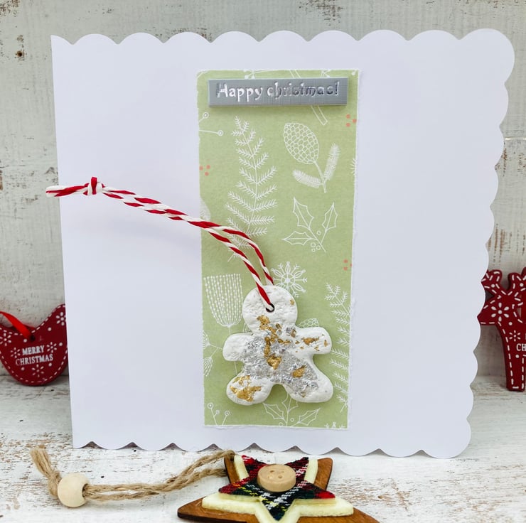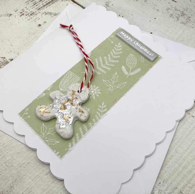 This gift card is perfect to give as a card and gift rolled into one. It has a cute Christmas gingerbread man made from a white air dry clay attached to the front of the card which can be taken off and used to hang around the home or on your Christmas tree. It is painted in white acrylic paint and decorated with gold and silver leaf to make it sparkle.