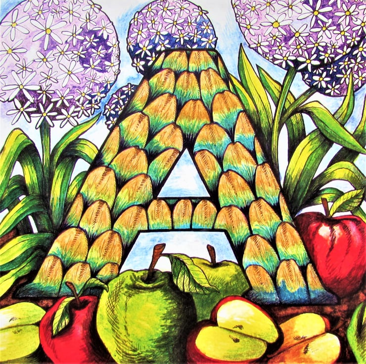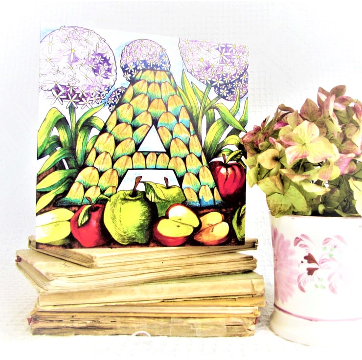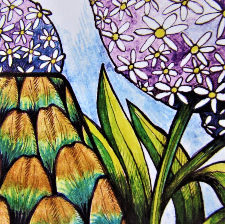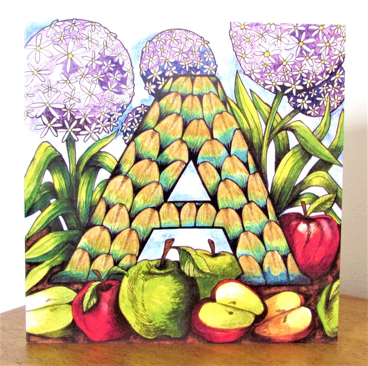 One of my Alphabetical card series which features flowers, fruit and vegetables...from A to Z. The original design was drawn in ink and then coloured with watercolour paint and gold acrylic paint on paper.