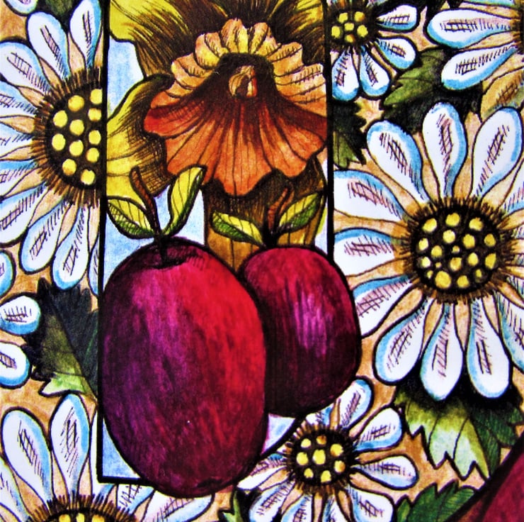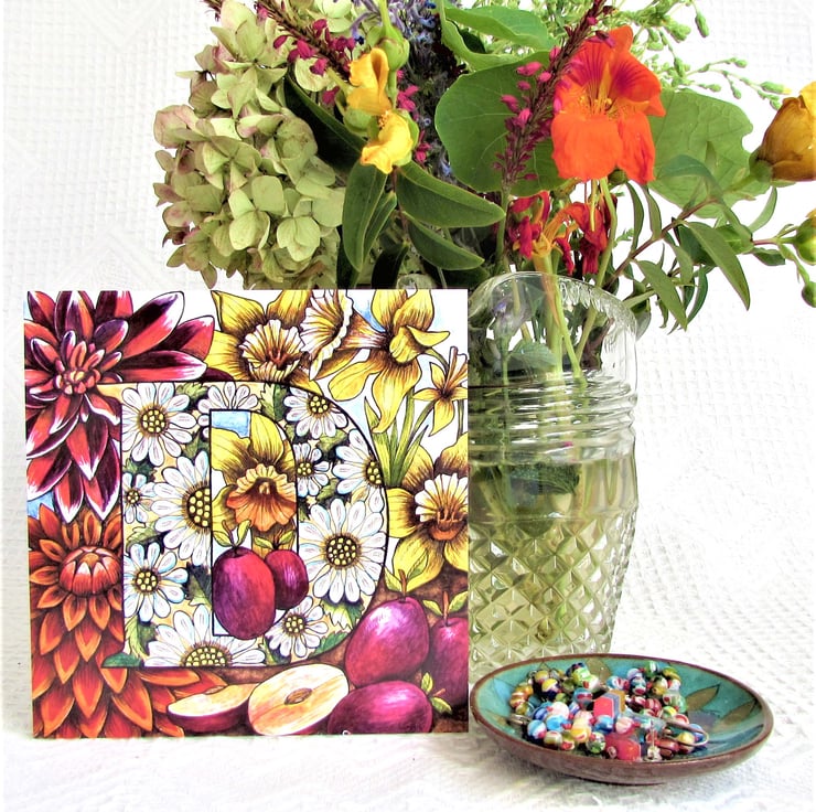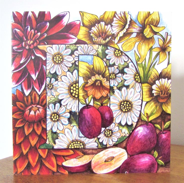 One of my Alphabetical card series which features flowers, fruit and vegetables...from A to Z. The original design was drawn in ink and then coloured with watercolour paint and gold acrylic paint on paper.