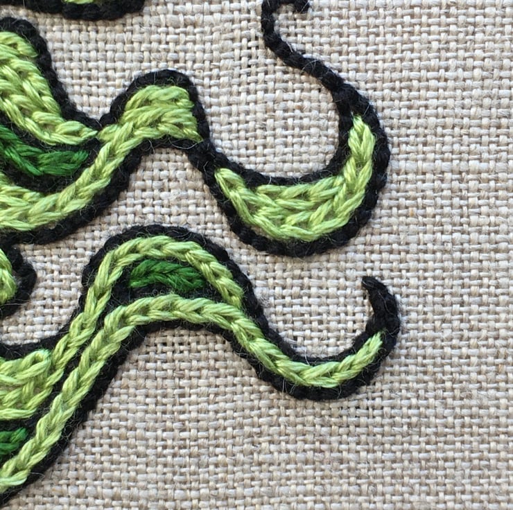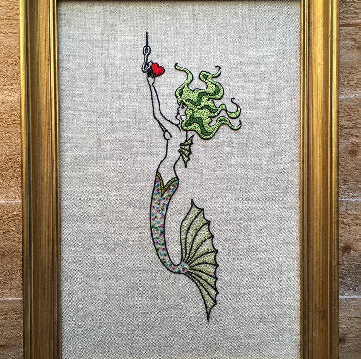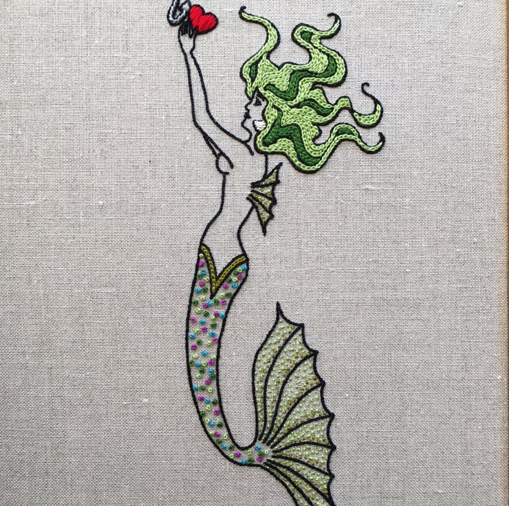 Along side this I used chain stitch to give the illusion of flowing hair in a bright and dark green thread.