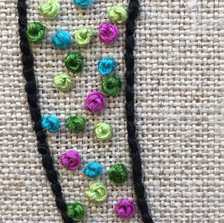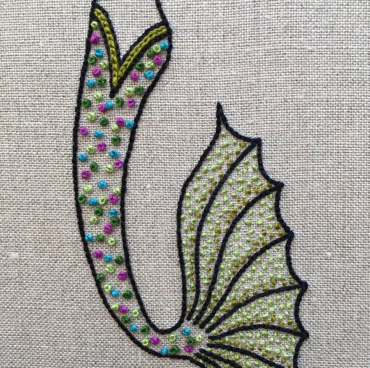 I have decorated her tail in French knots and seed stitches. These are in purple, teal, bright and forest green.