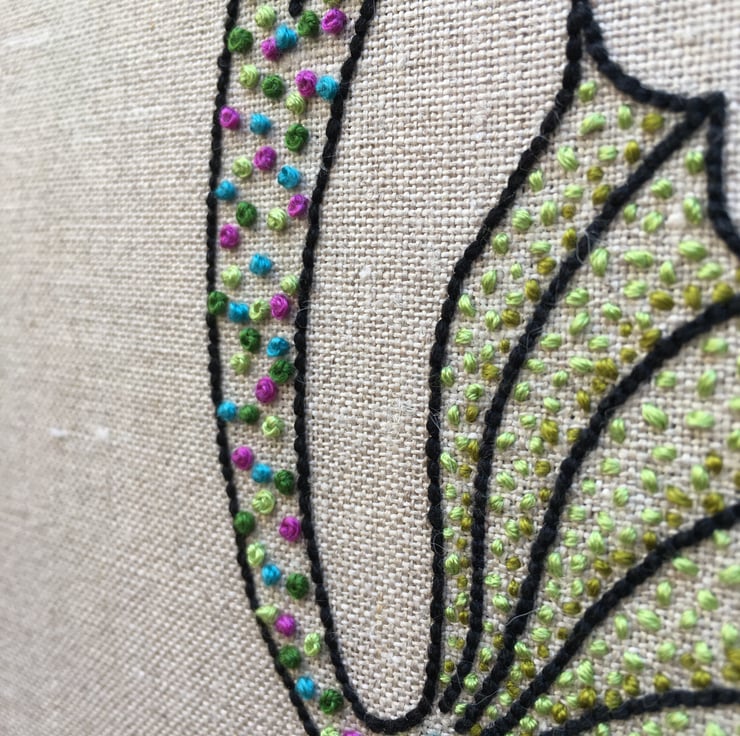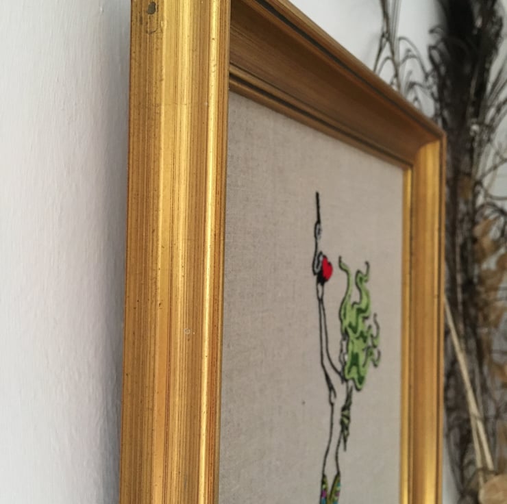 From my own original drawing which I drew in a tattoo art style, I have created this unique piece of hand embroidered textile art to adorn any wall.