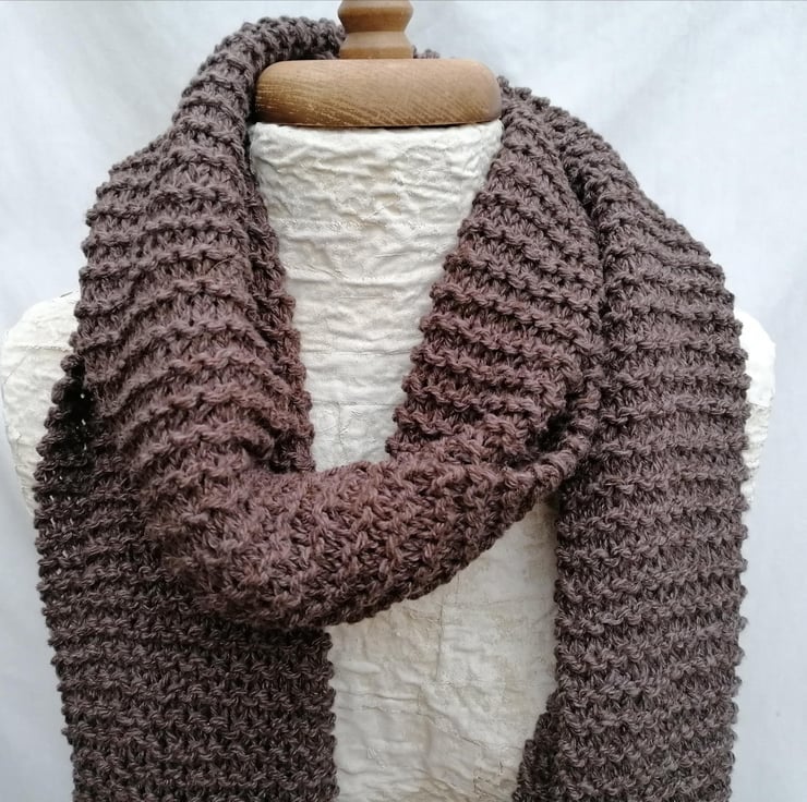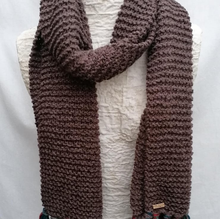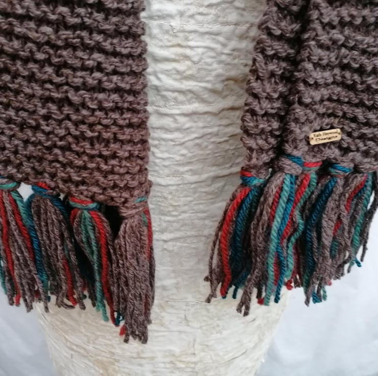 Stand out from the crowd with this hand knit, chunky scarf in a soft brown shade with multicoloured fringing. This scarf is hand knit in garter stitch with a colourful fringe of russet and green shades