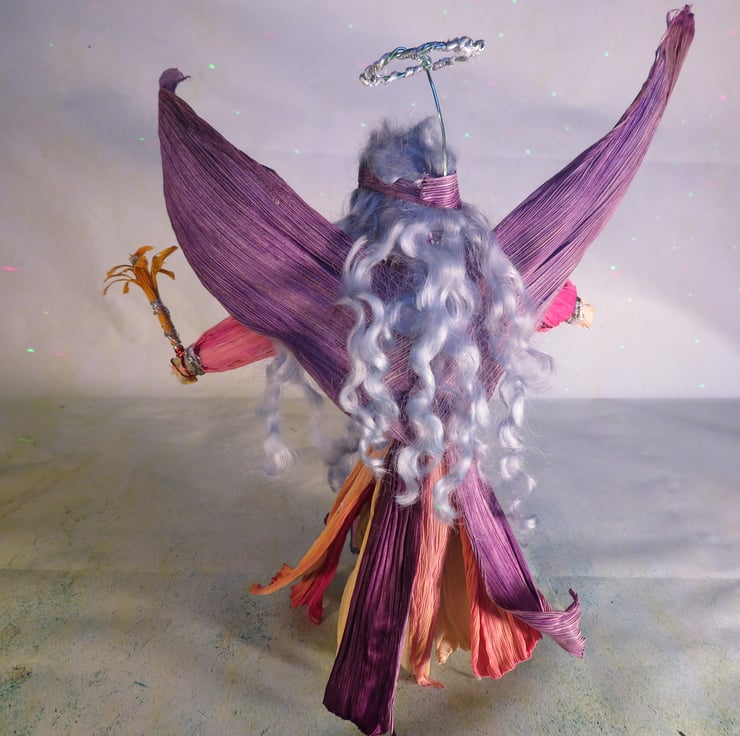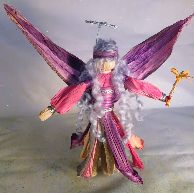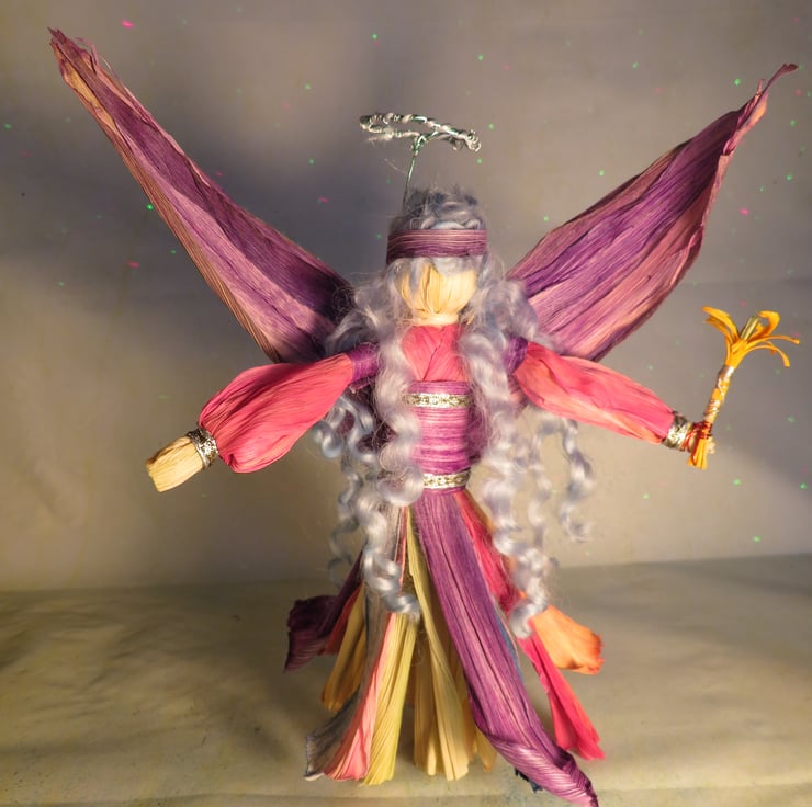 Home made tree angel made out of corn husks and dyed sheep fleece, accompanied by a flower wand, wings and halo. Edged with silver ribbon.