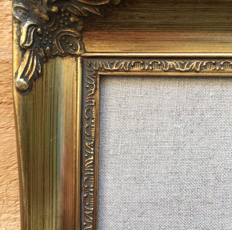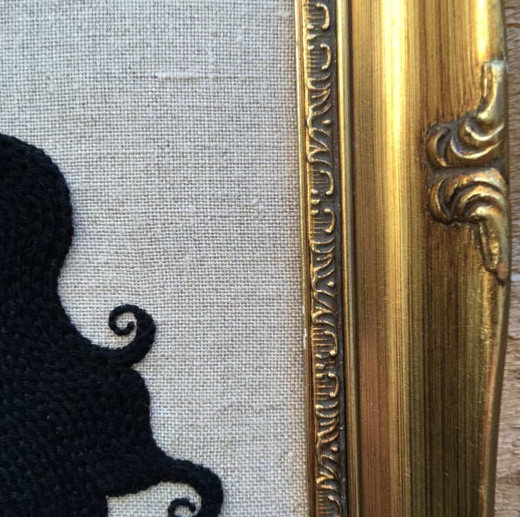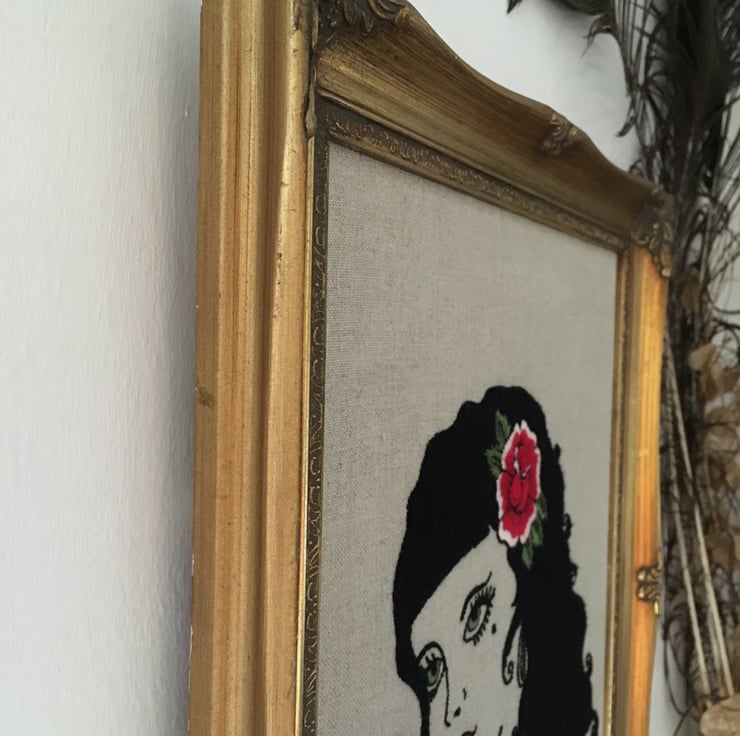 I have carefully hand embroidered her using vintage Anchor and DMC threads, using various stitches on raw linen then framed in a gold vintage frame without glass as it distorts the stitches.