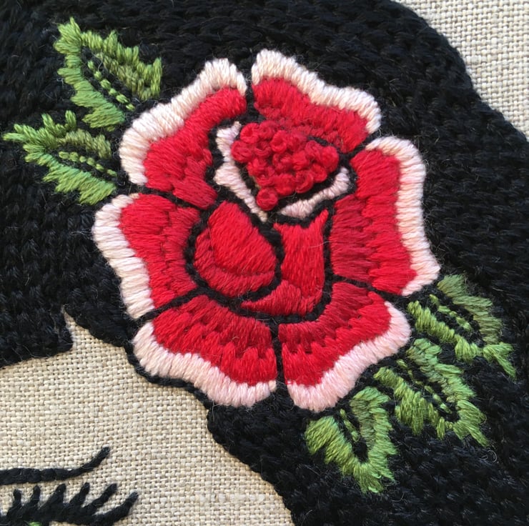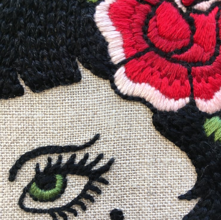 The bold outline is constructed using black backstitch, to reflect a tattoo outline.
