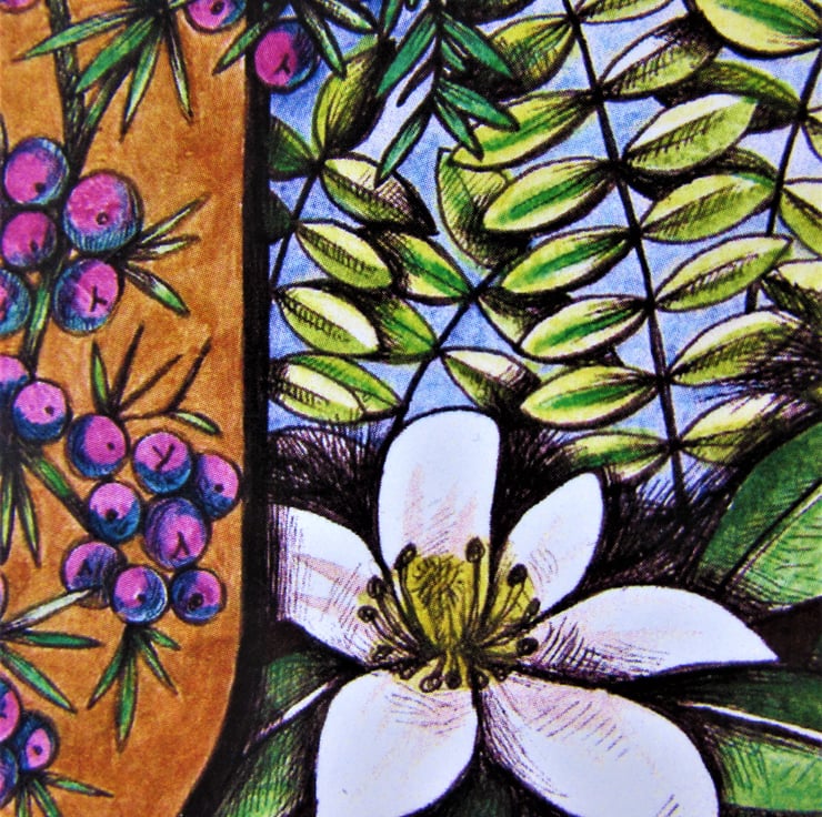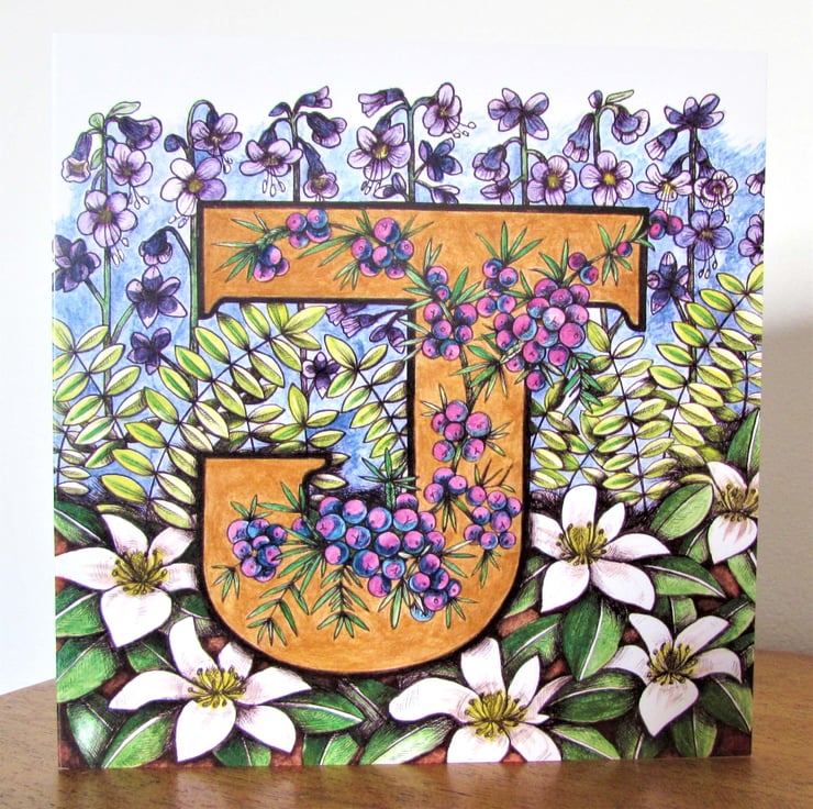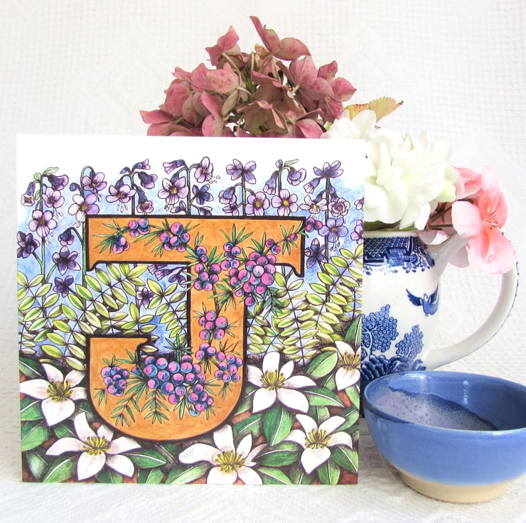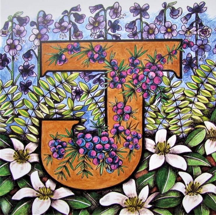 One of my Alphabetical card series which features flowers, fruit and vegetables...from A to Z. The original design was drawn in ink and then coloured with watercolour paint and gold acrylic paint on paper.