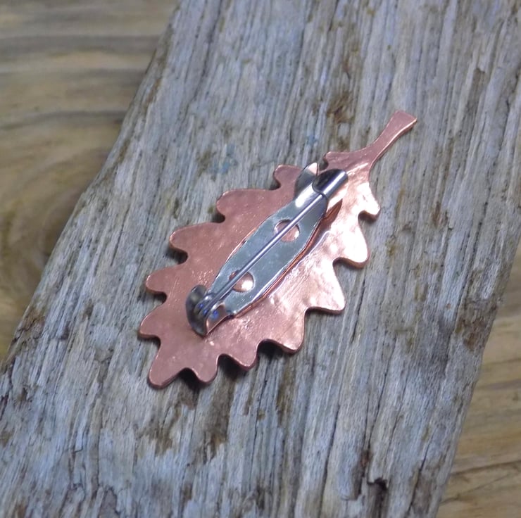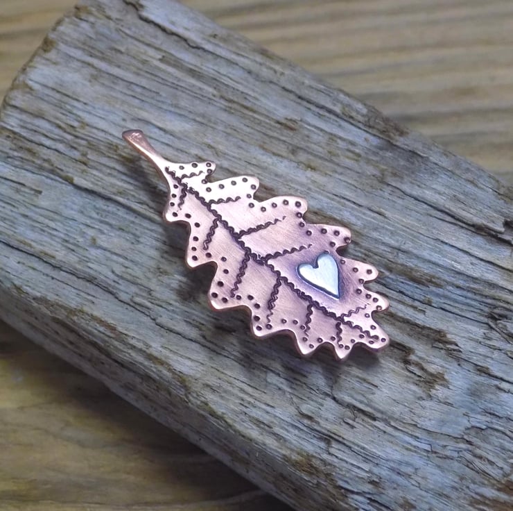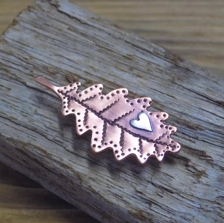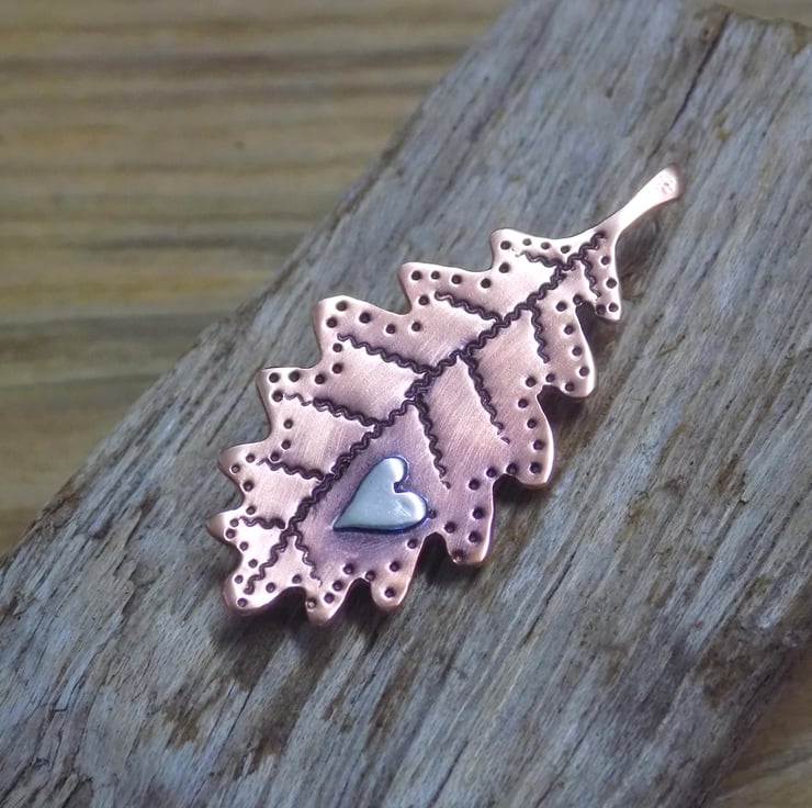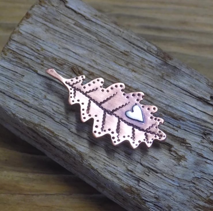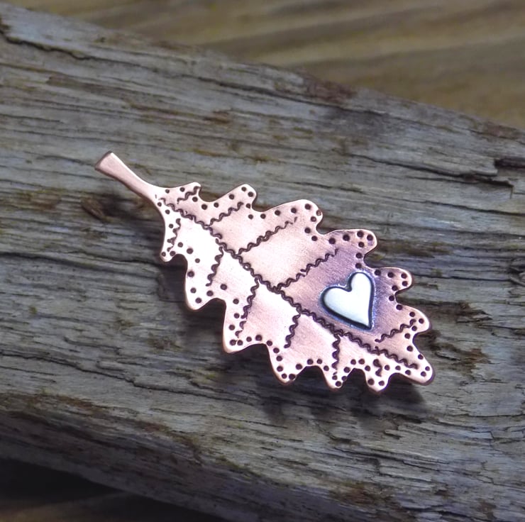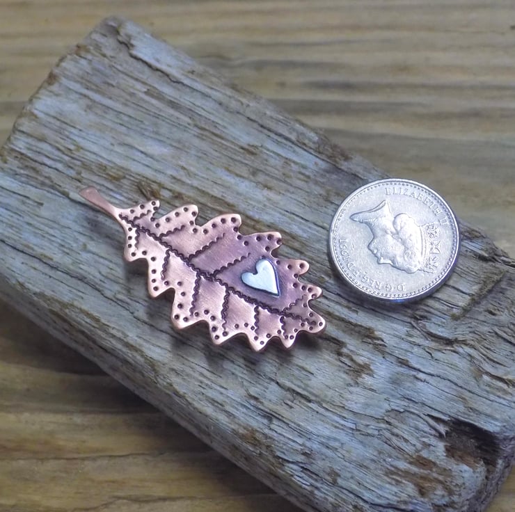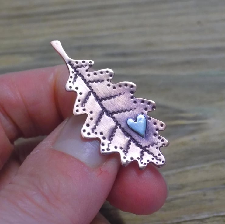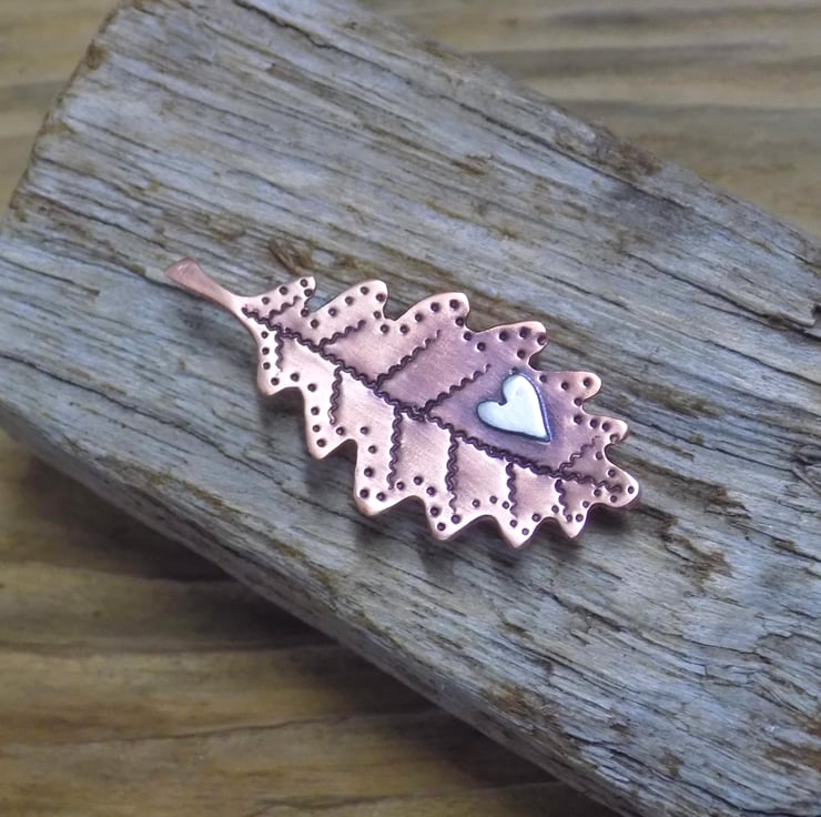 A pretty little oak leaf brooch made from a combination of copper and silver sheet. Hand sawn from copper with a tiny sterling silver love heart soldered to the front. Decorated with individual punch marks to create the veins and a little edging. Given an aged finish to pick up the detail. A sturdy brooch setting has been fixed to the back with strong jewellers glue.