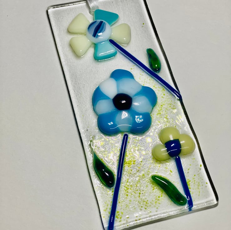 Beautiful for catching the light and bouncing it back into the room . This glass hanging decoration in retro styled blue flowers is pretty and would look lovely in any home