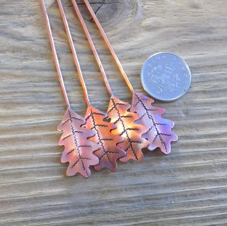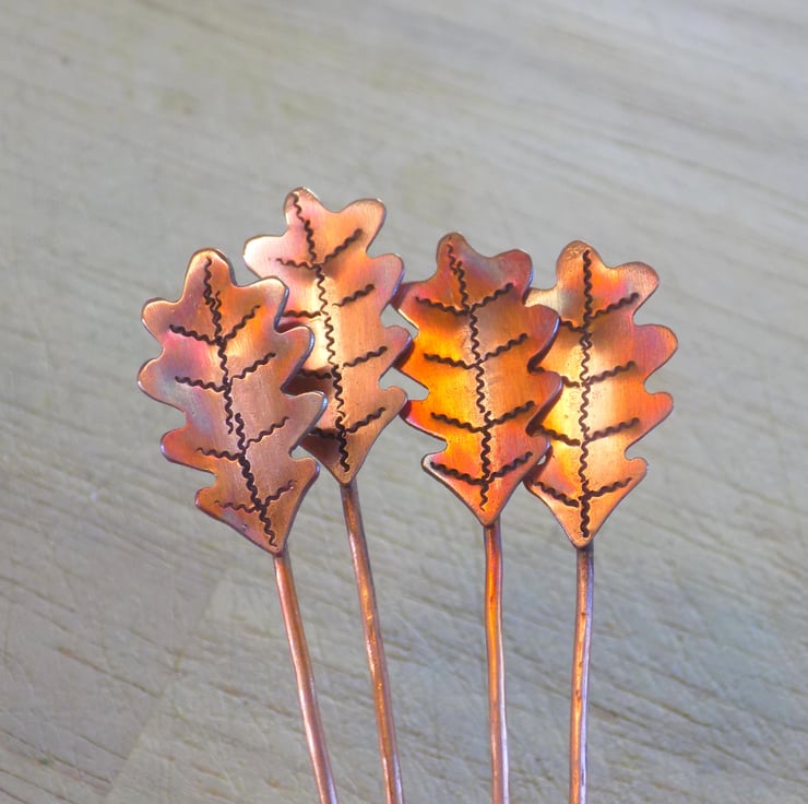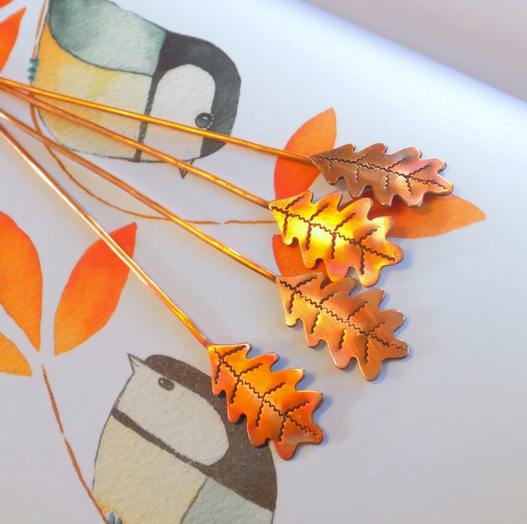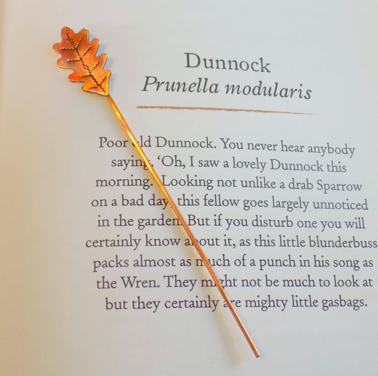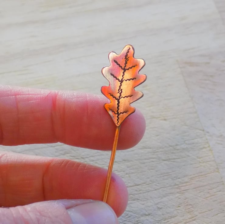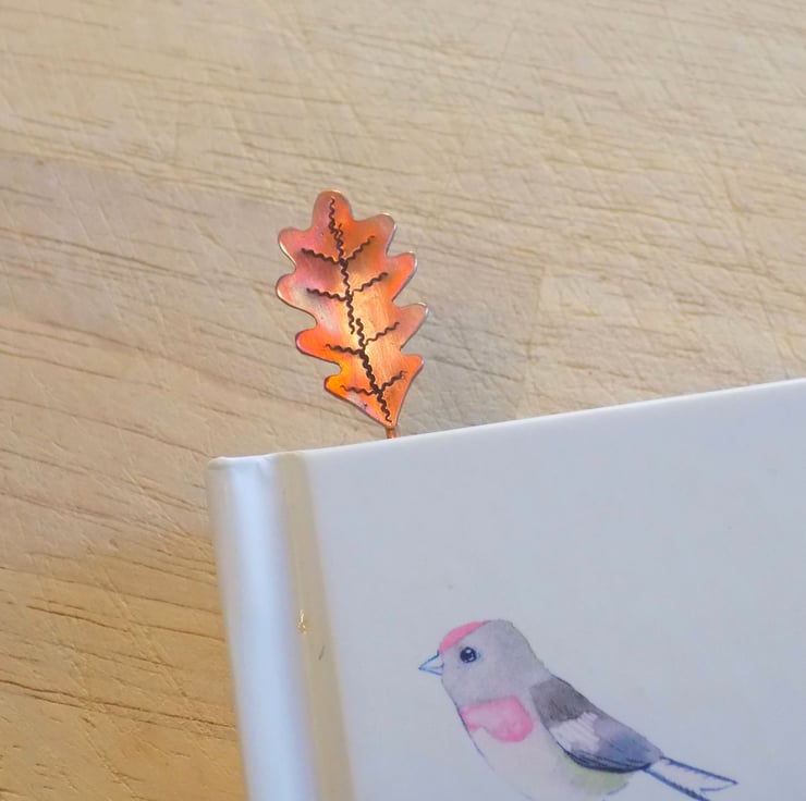 A mini bookmark made from copper sheet and wire. The oak leaf has been hand sawn from copper, textured with a punch then 'flame painted' with fire - this technique always give a slightly different finish so no two leaves will be exactly the same. Simply soldered to a thick copper wire, sanded smooth at the end.