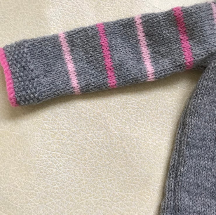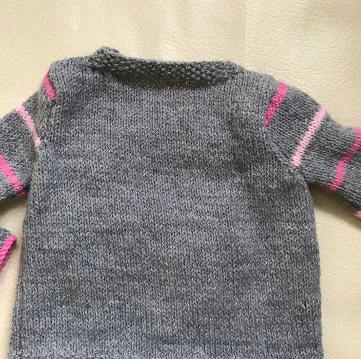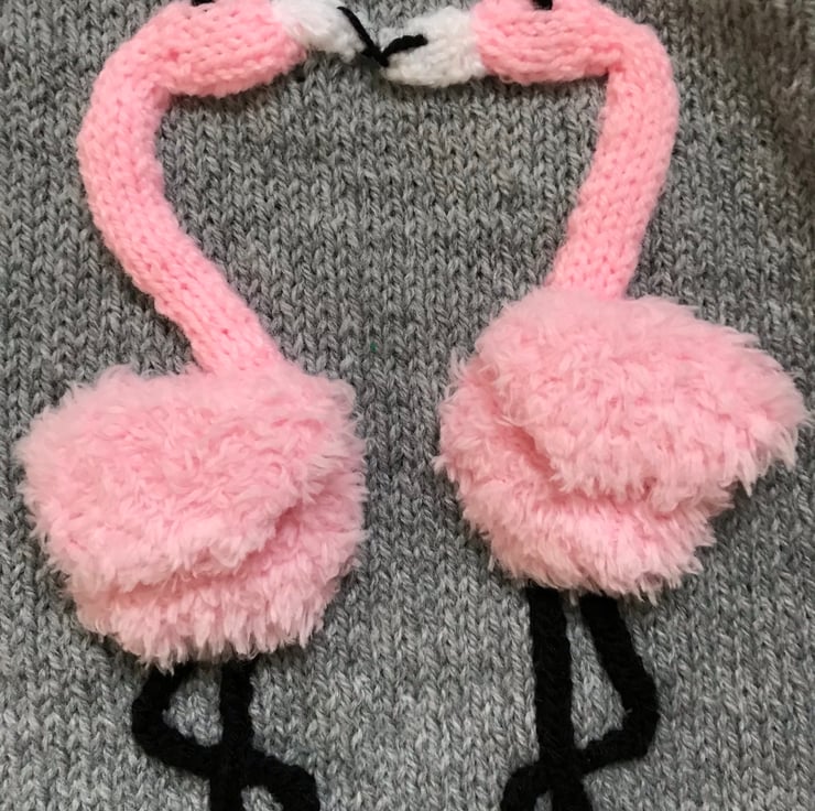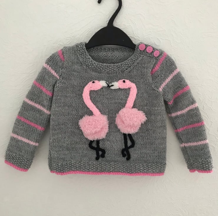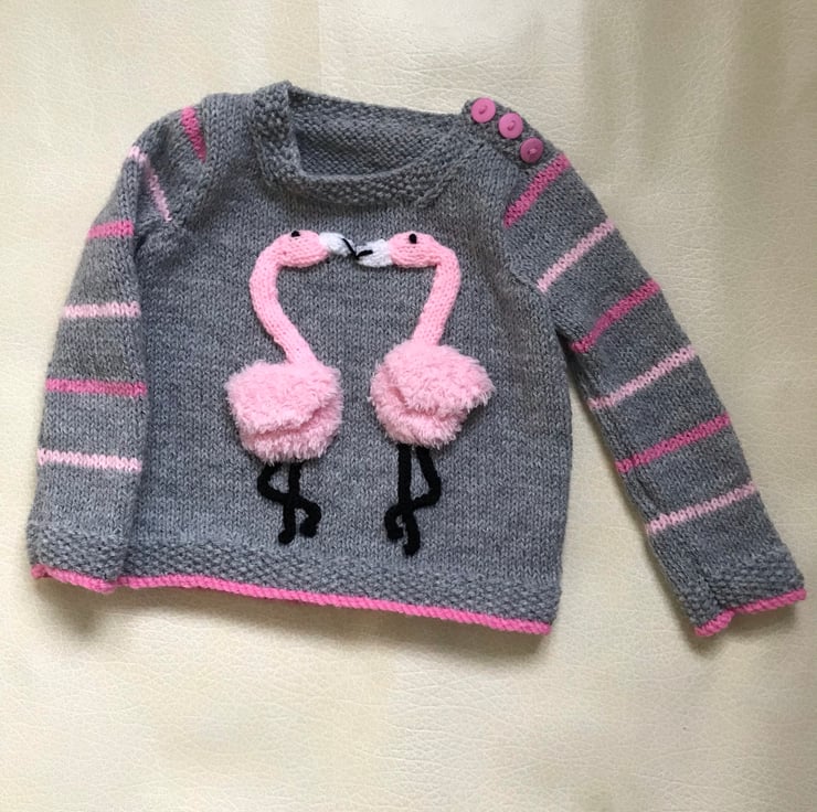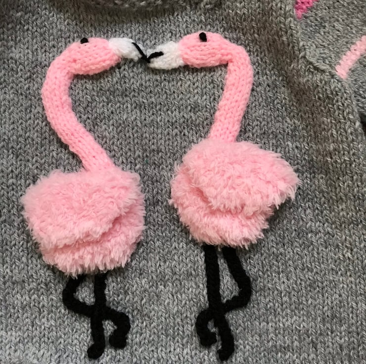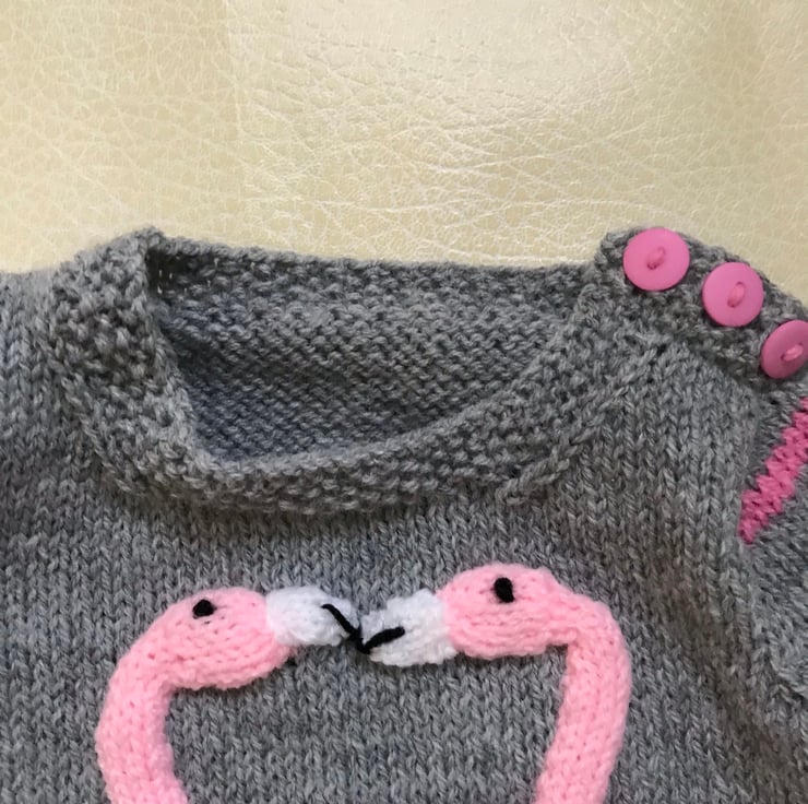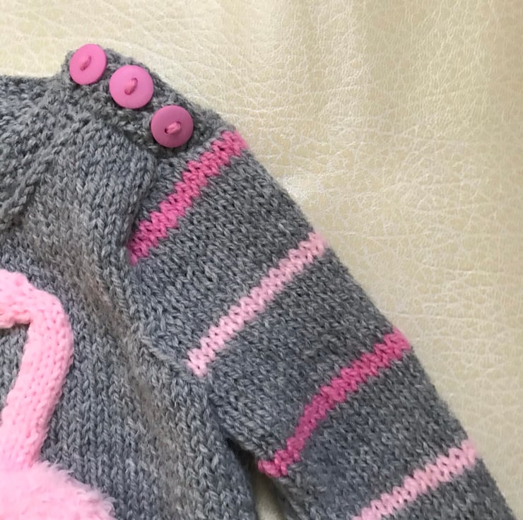 This adorable jumper is hand knitted in an acrylic yarn. The background colour is platinum grey and it has stripes on the sleeves in two shade of pink. The edges of the moss stitch hem and cuffs are worked in the darker shade of pink. It has a moss stitch neck and fastens on the shoulder with three pink buttons. The front of the jumper features two flamingos. The bodies and wings are worked in a fluffy pink yarn, the legs are black and the neck and head are pink with a white beak. The flamingos were knitted separately and then sewn on.
