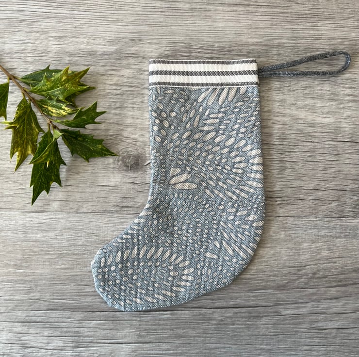 This small stocking in muted colours would be perfect for little gift wrapping or simply as a decoration to hang from a mantlepiece at Christmas.
