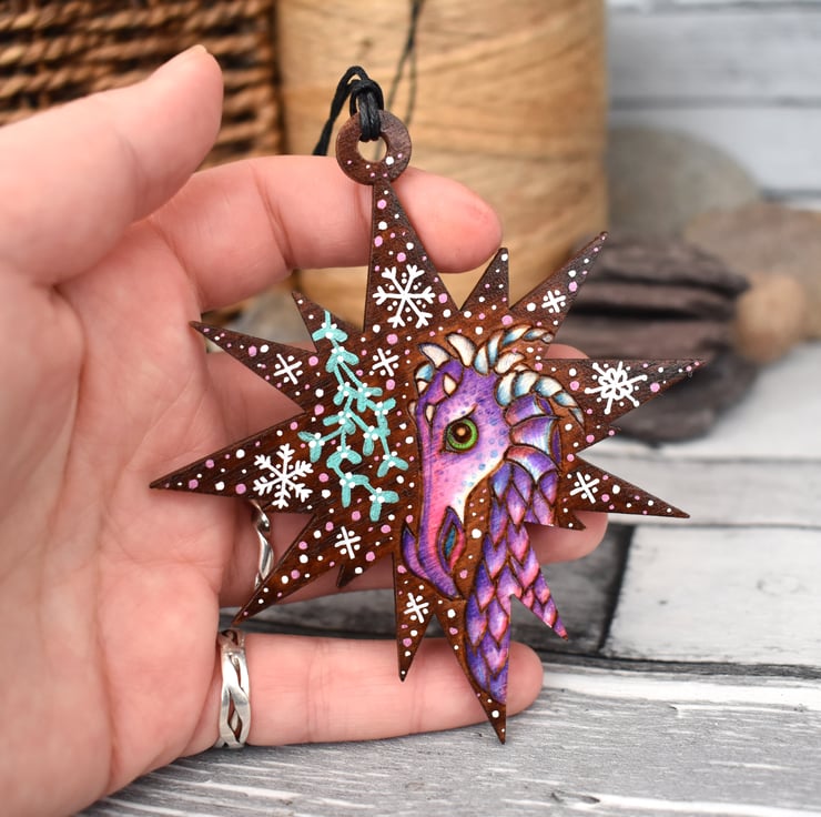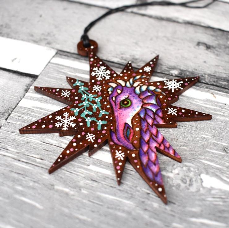 A pink purple dragon, sat beneath the mistletoe, surrounded by snowflakes. Burned by hand using pyrography and coloured using art pencils. I've stained the wood to enhance it.