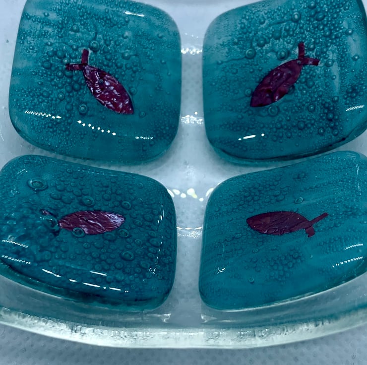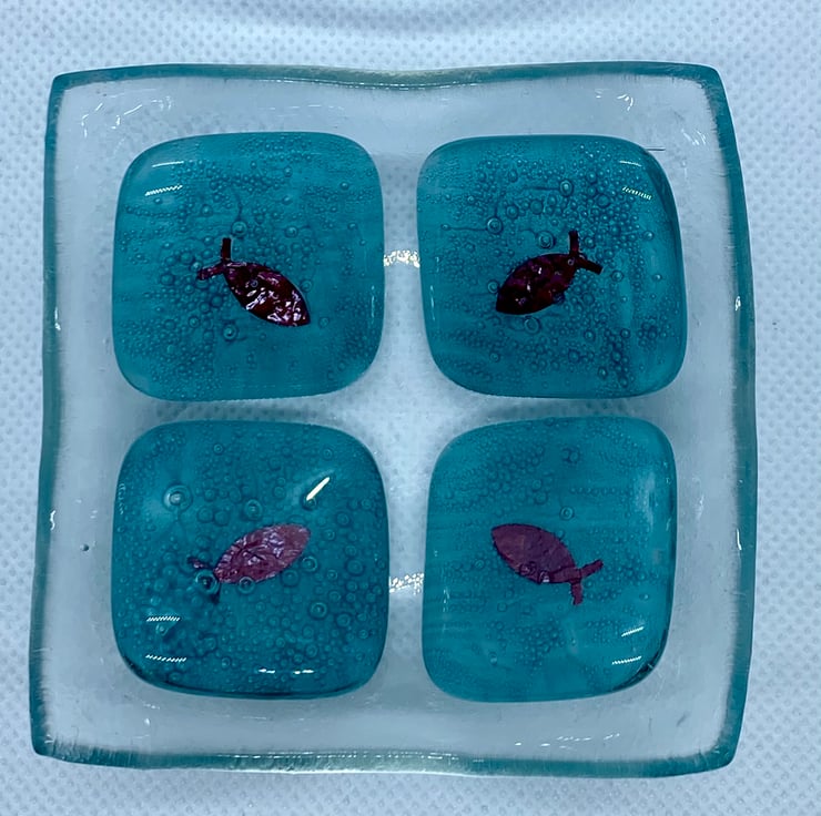 This square dish features four smaller glass elements with teal coloured bubbles and copper foil fish which have turned a rich red colour.