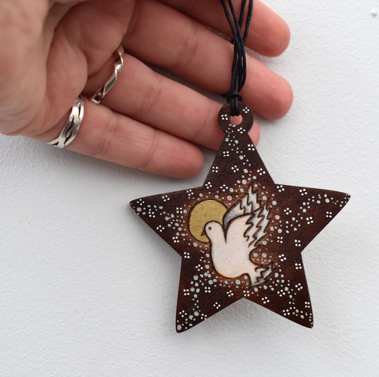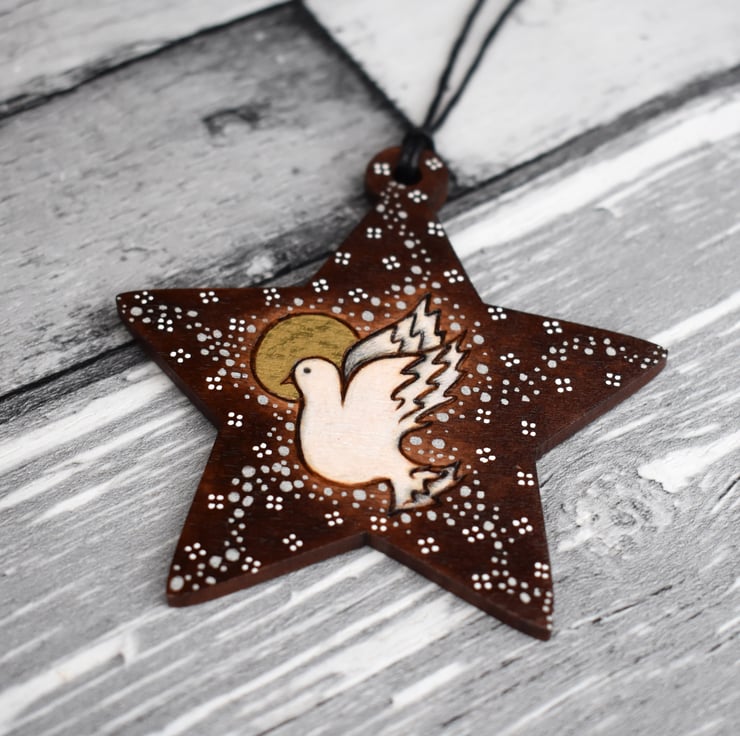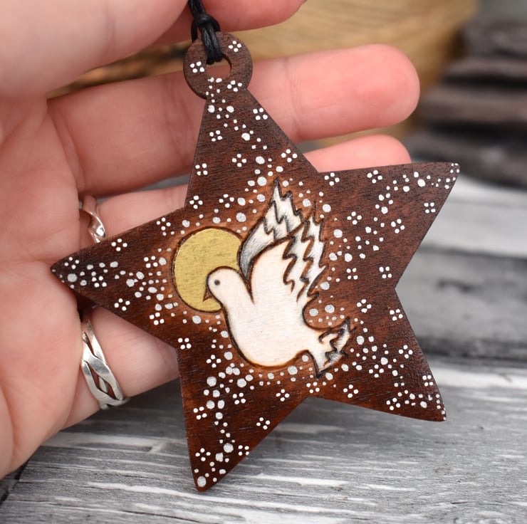 A flying white dove surrounded by stars and snowflakes. Burned by hand using pyrography and coloured using art pencils. I've stained the wood to enhance it.