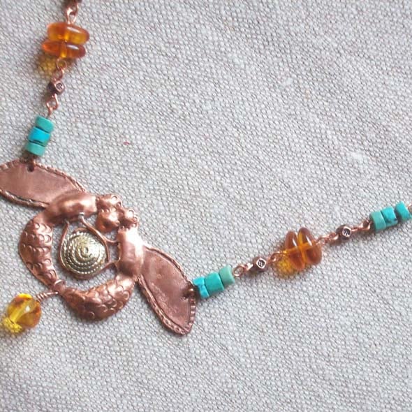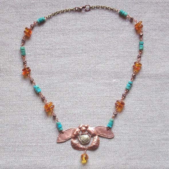 This piece is based on an ancient Mediterranean design. Copper is one of the earliest metals used by man and I love its warm colour. Two bees surround a drop of pollen crafted in twisted brass wire, a drop of honey coloured amber hangs from their bodies. The creatures hang from a beaded chain of copper beads, amber and turquoise beads. Comes to you in a gift box. Please contact me regarding multiple postage or outside UK as prices vary so much.