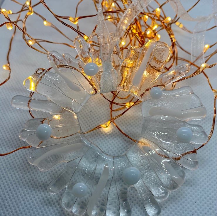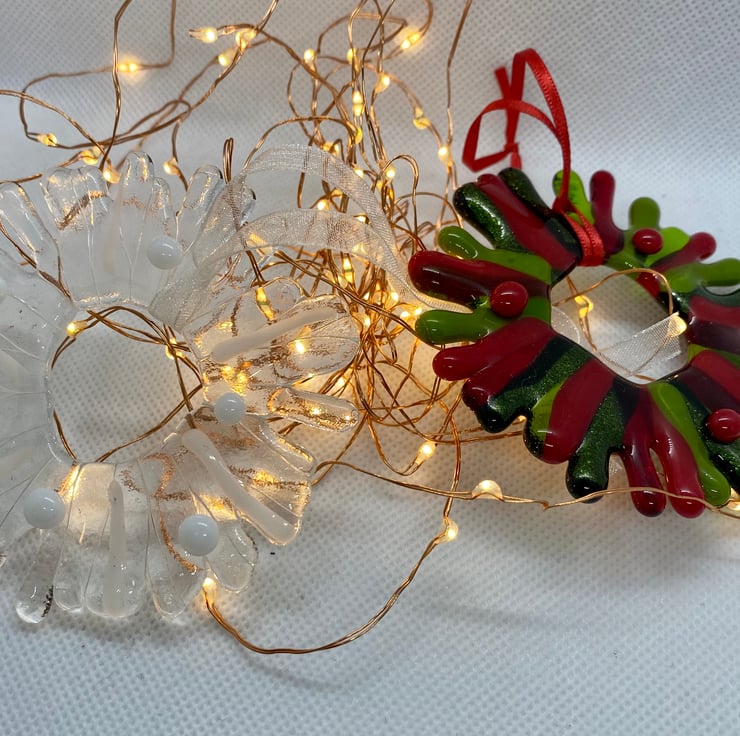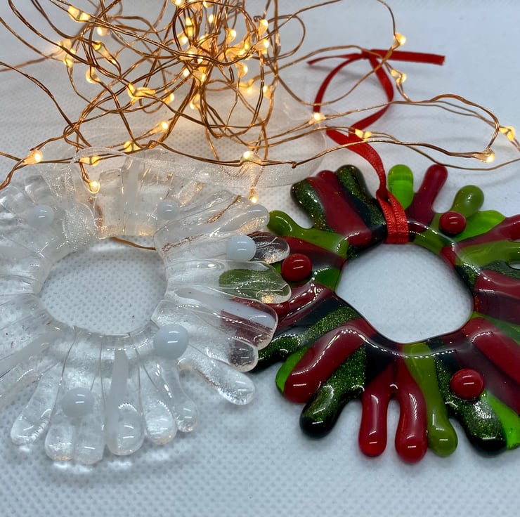 This wreath decoration is made up of over 20 individually hand cut glass pieces and is available in shades of green with red ‘berries’ or clear and white with white ‘berries’.