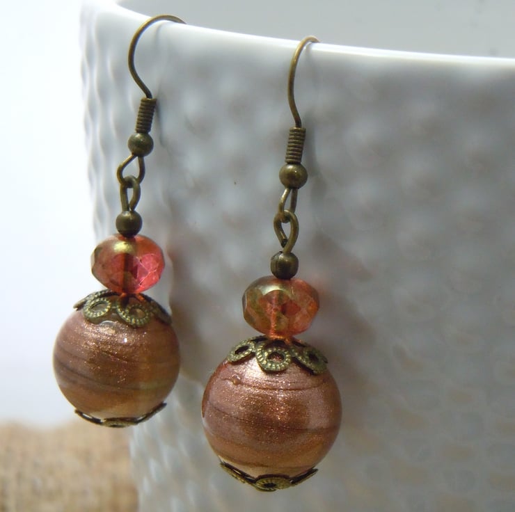 Earrings with round goldstone glass beads & faceted Czech glass beads with a metallic coating to highlight the copper tone in the large bead. The ear wires & fittings are in antique bronze.