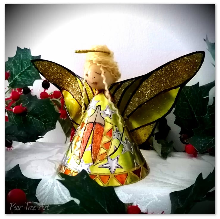 This Angel fits on the top of Christmas tree also has string loop for hanging up if not used as a tree topper.