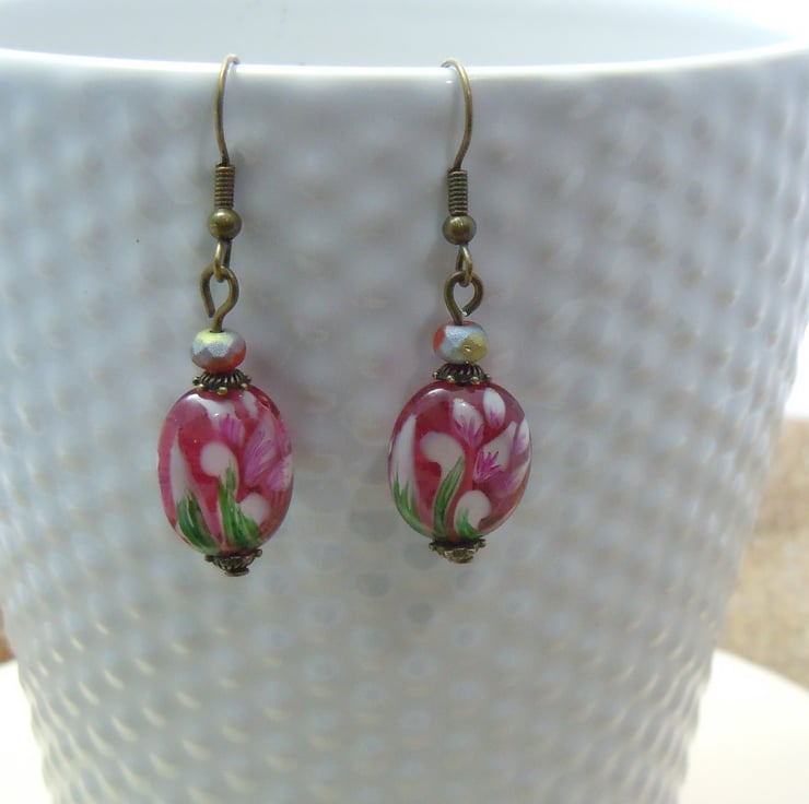 Earrings with gorgeous artisan lampwork red/pink/green/purple oval glass beads with a flower design & Czech glass red frosted beads with ear wires & fittings in antique bronze. An ideal gift for a lover of flowers.