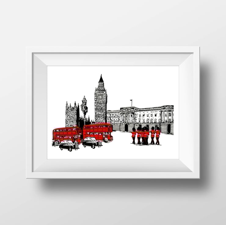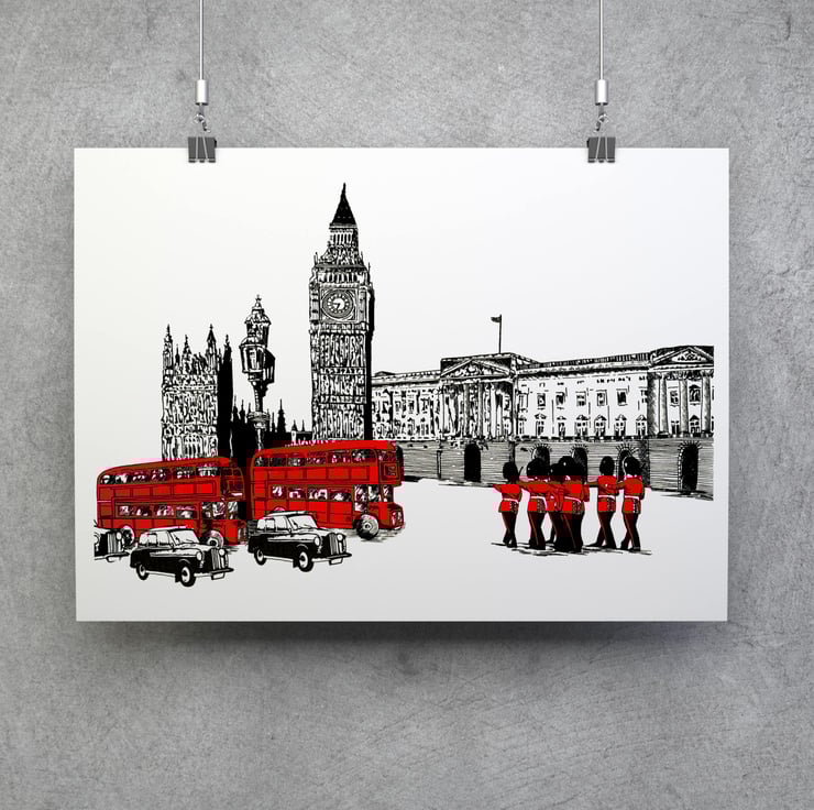 This beautifully detailed illustration of the London features the landmarks... Buckingham Palace, Big Ben and The Houses of Parliament alongside the iconic Changing of the Guards and the Black cab and Red London Bus providing a pop of vibrant colour to this beautiful Black & White Illustration.