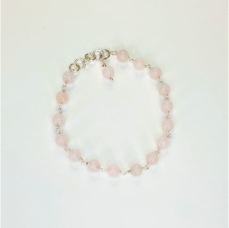 This Delicate Bracelet is Handmade using 925 Sterling Silver wire, 925 Sterling Silver findings and Rose Quartz beads. These are linked together using the rosary link technique.
