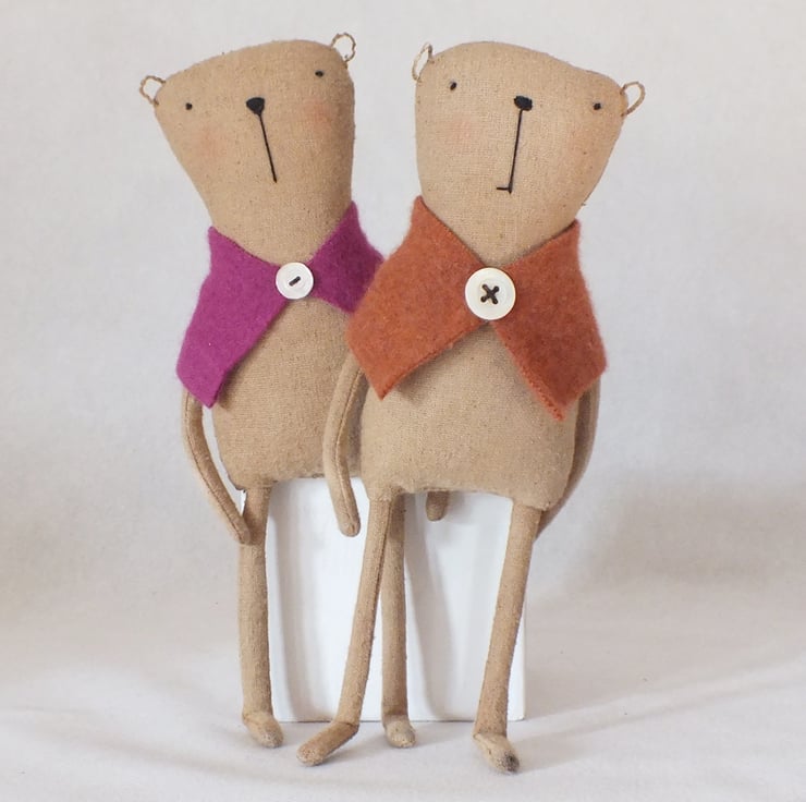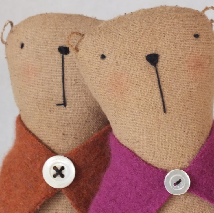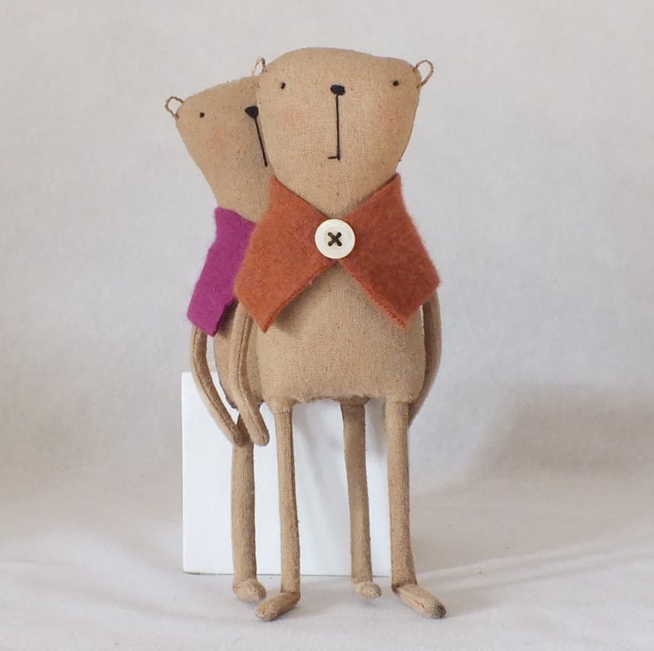 This little ted measures about 23 cms. He is made from coffee and cinnamom dyed Osnaburg (sanded back -of course ) fabric with an embroidered face ,button loop linen ears and has wired arms and legs .He wears a lambswool ginger coloured wrap trimmed with a vintage mother of pearl button.