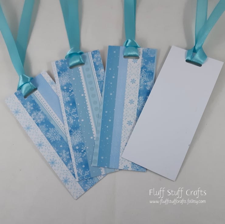 Pack of 4 gift tags, cut from a sheet of white card which has been layered with blue and white snowflake paper offcuts. A great way to use up the leftover slivers of paper from other projects, which would otherwise be discarded. The reverse has been left blank for your own greeting. Each tag has a length of pale turquoise satin ribbon, to attach to your gifts.