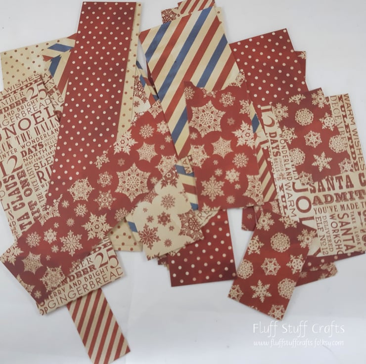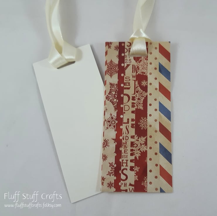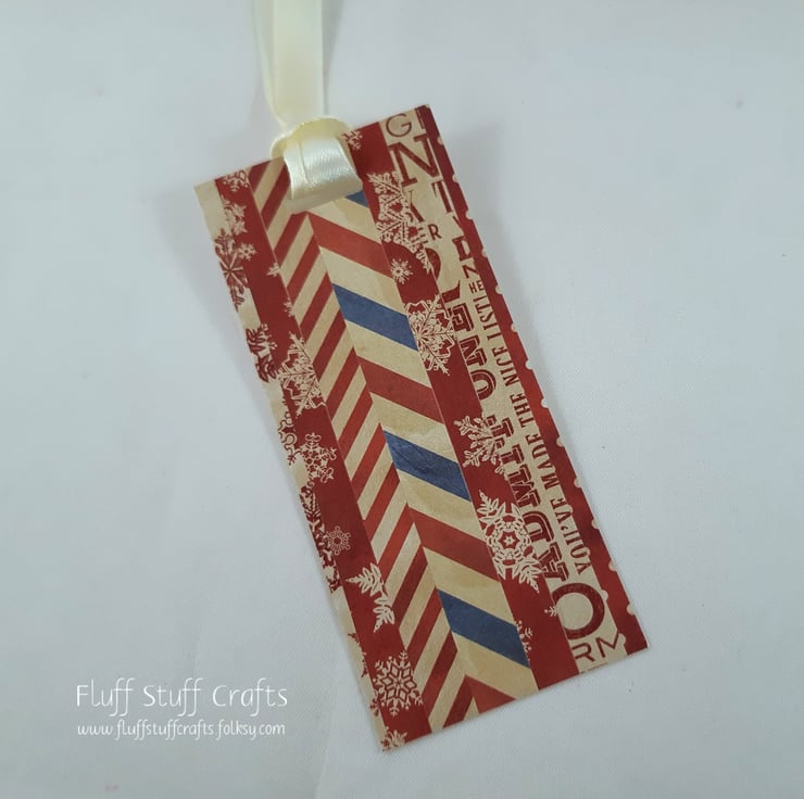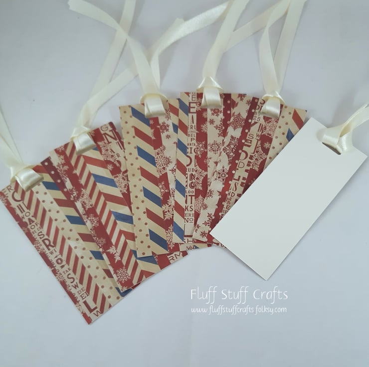 Pack of 6 gift tags, cut from a sheet of cream linen card which has been layered with offcuts from multiple red and cream themed papers. This is a great way to use up the leftover bits of paper from other projects, which would otherwise be unused. The reverse has been left blank for your own greeting. Each tag has a length of cream satin ribbon, to attach to your gifts.