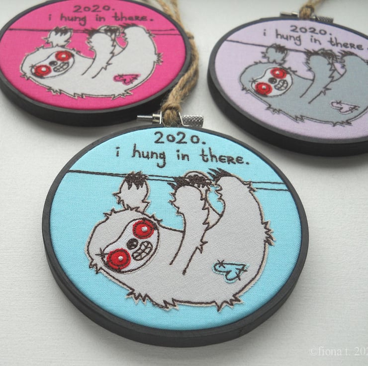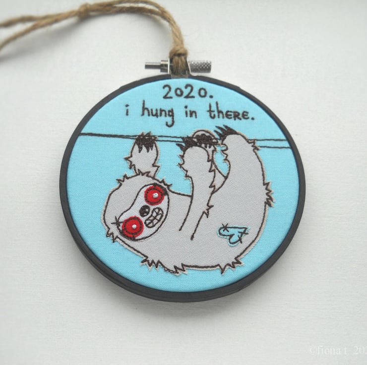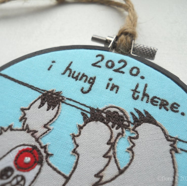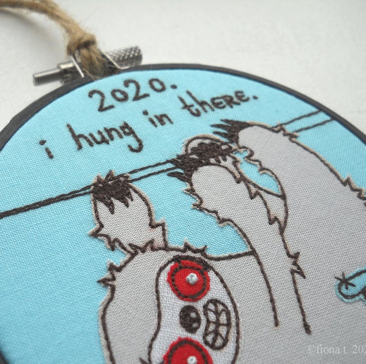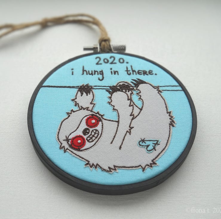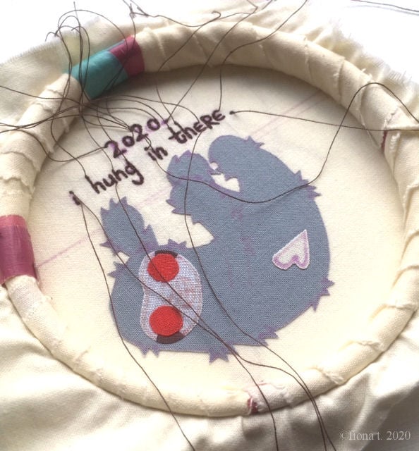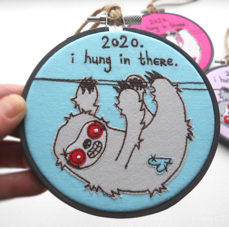 the text “2020. i hung in there.” is written freehand, and the hoop is similarly signed on the reverse.