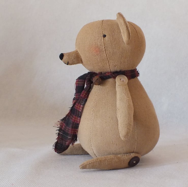 Teddy is made from (yes you've guessed it ) coffee and cinnamon dyed Osnaburg fabric ,sanded back for a worn appearance.He has tiny traditional boot button type glass eyes and embroidered nose. He has button jointed arms and legs using odd vintage buttons.His scarf is homespun cotton ,trimmed with a rusty bell.