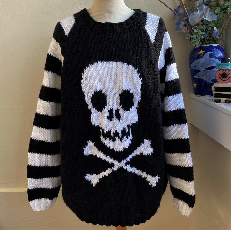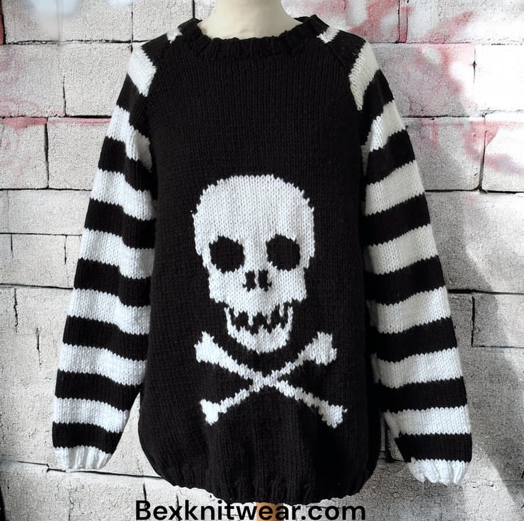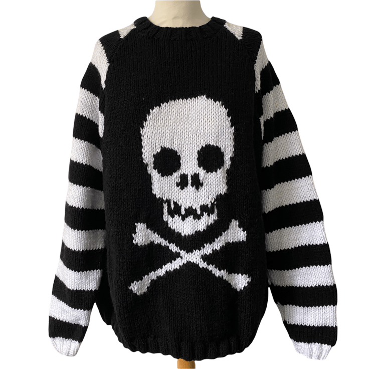 Round neck sweater with Skull and Crossbones image knitted into the front