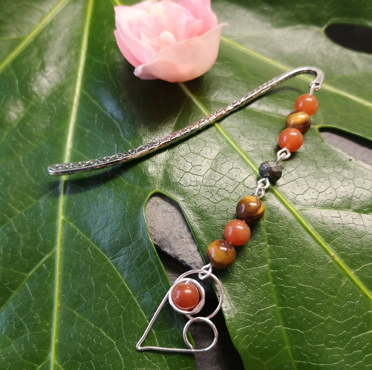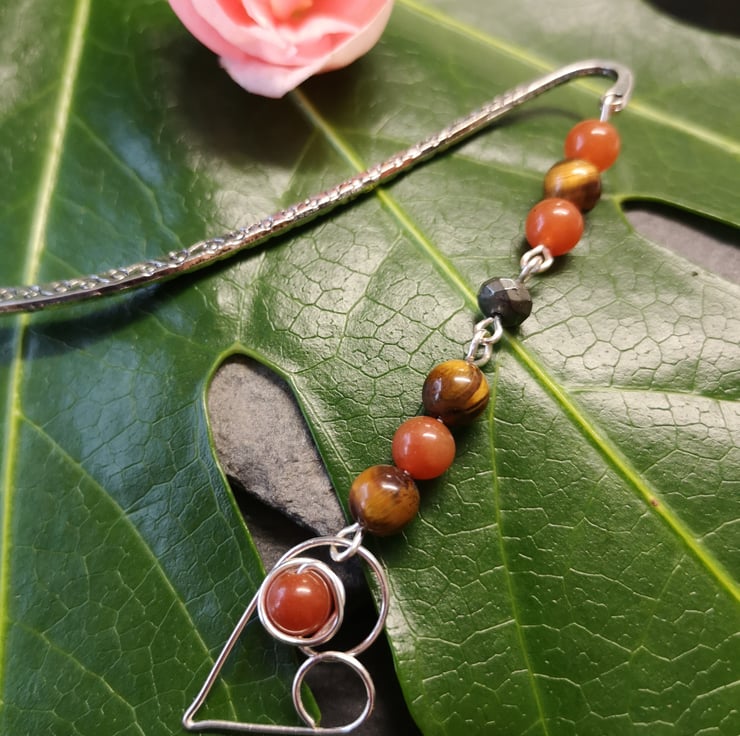 Handcrafted wirework heart bookmark with an 8mm carnelian, tigers eye and pyrite gemstone beads. The heart is made in a rose gold plate wire.