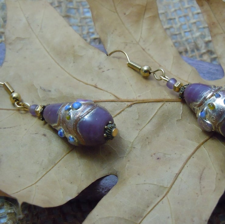 Artisan Venetian style Lampwork glass earrings in purple drop beads with swirls of goldstone glass. The ear wires & small bead in gold plate & bead caps are in antique bronze.