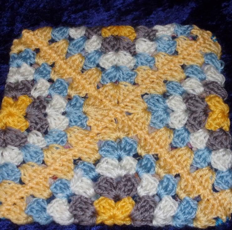This hand crocheted Granny Square pouch is made using acrylic yarn, a button for fastening and 100% Cotton Lining which contrasts with the colours of the granny squares.