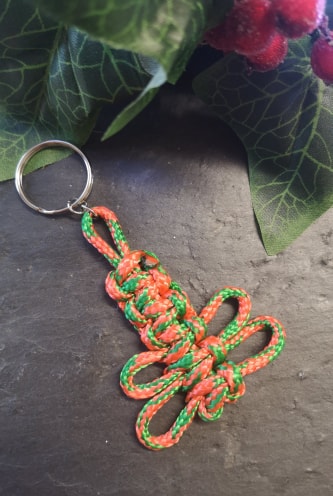 Colourful Orange and green macrame dragon fly. Made by hand using 3mm paracord and attached to a keyring. Can also be used as a tree decoration or bag charm.