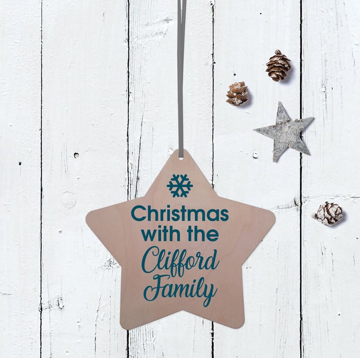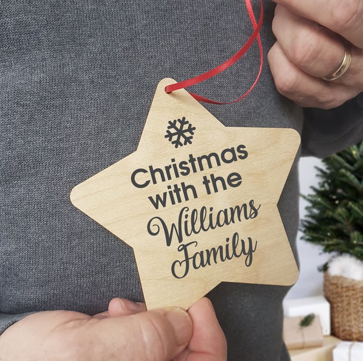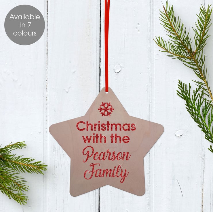 This delightful wooden Family Christmas star will look gorgeous on your tree, year after year. Personalised with your family surname, it’s available in a choice of colours and finishes – you can even choose the ribbon colour!