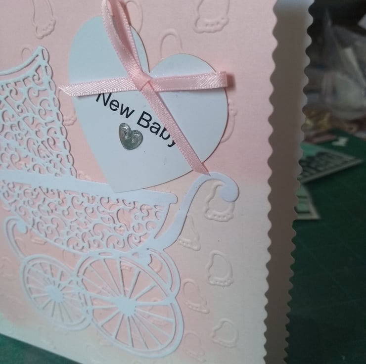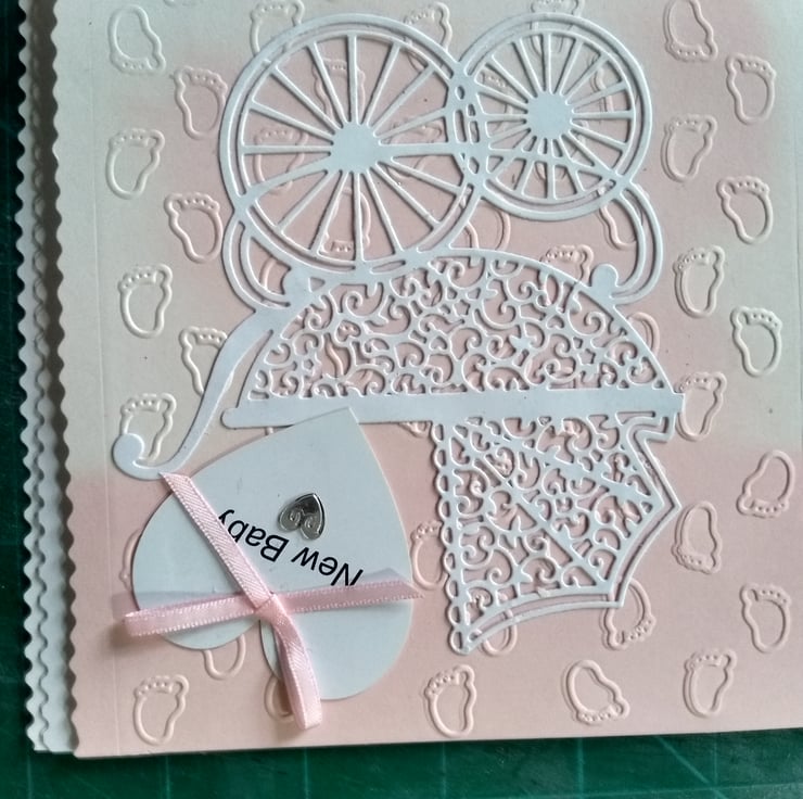 A completely handmade and uniquely designed card. Pale pink shaded card has been embossed with cute baby feet. A pram due cut from white card. Finished off with new baby tag, heart sequin and pink ribbon bow