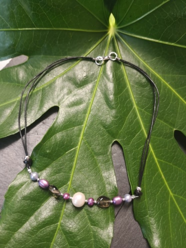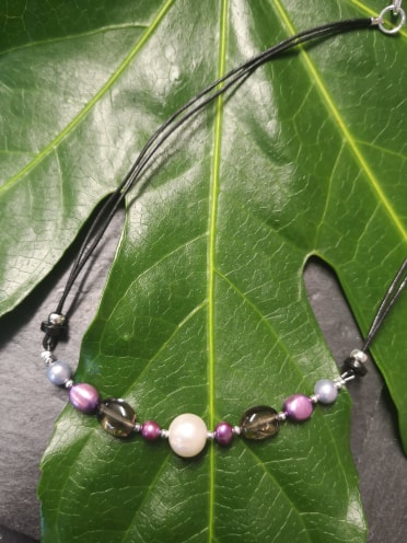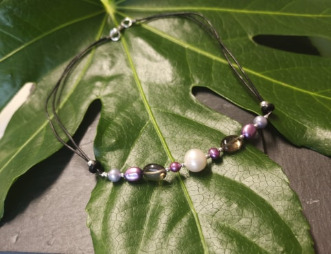 The centre bead is a 10mm Ivory freshwater pearl surrounded by freshwater pearls and smokey quartz gemstones. The beads are strung on tigertail wire and securely attached to a double stranded leather thong necklace with lobster clasp fastening. There are wooden beads and silver plated beads threaded onto the side of the leather thong.
