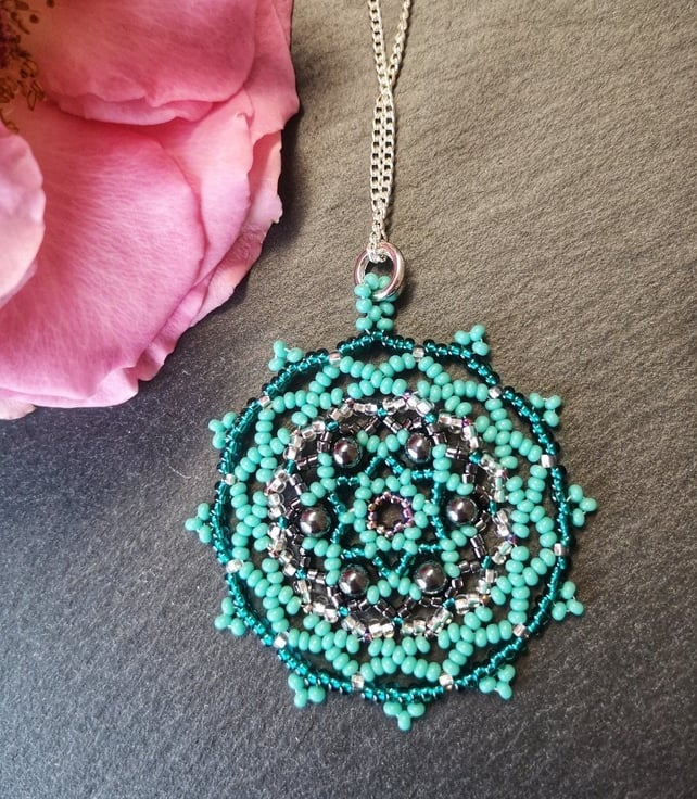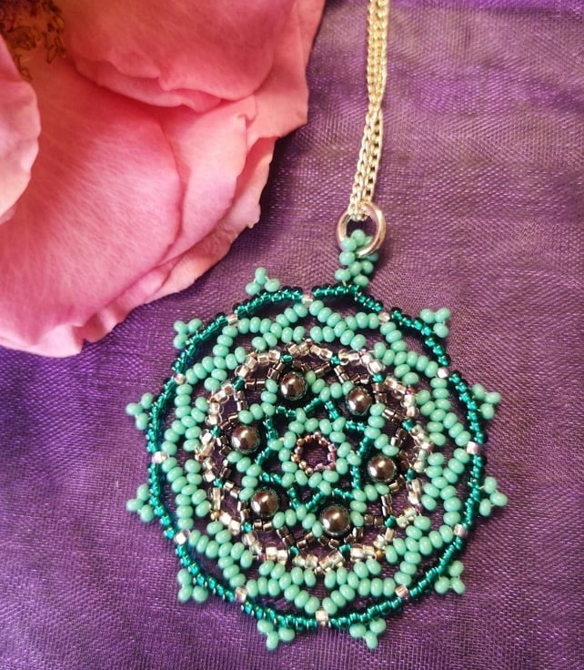 Hand stitched mandala necklace using specialist needle and beaders thread. This intricate work is created by weaving seed beads of varying sizes and combining them with beautiful hematite gemstone beads.