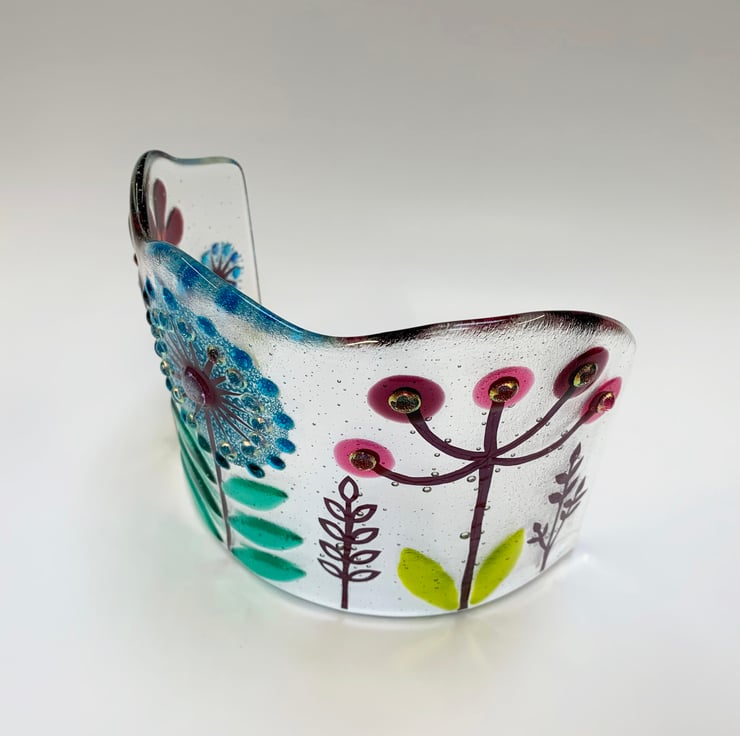 To make it, I used art glass and cut 2 pieces of transparent glass the same shape and size. I then hand cut copper foil with a scalpel into the shapes of stems and flowers. Next I add powdered glass and specialist glass paint which turns into turquoise bubbles in the heat of the kiln. I fire it slowly overnight in my kiln. Once completely cooled, I then add petals I've made out of art glass and coloured and dichroic dots which I have made previously to give some added interest to the design. A second firing is done overnight the next day to tack fuse the dots onto the design, so that they stand proud of the glass, giving it a 3D effect. Finally, the piece is fired a third time so it slowly slumps over a ceramic mould, giving it its curved shape.
