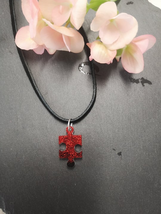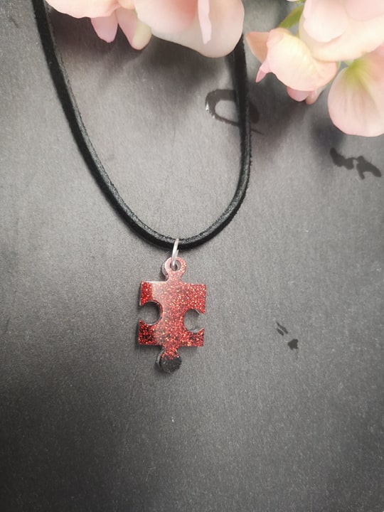 Handmade Red and black sparkle resin pendant in the shape of a jigsaw puzzle piece.