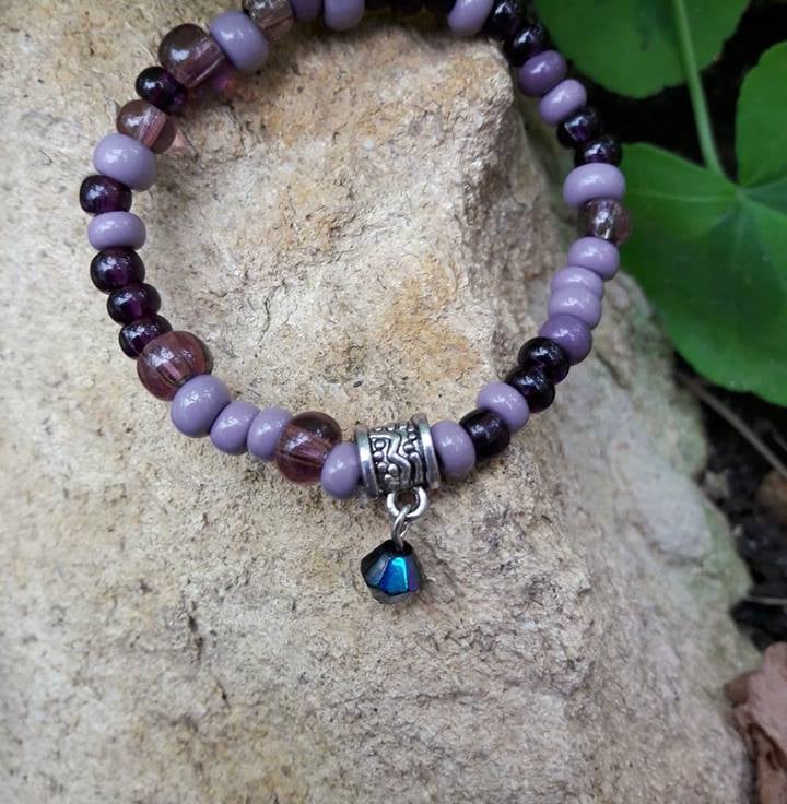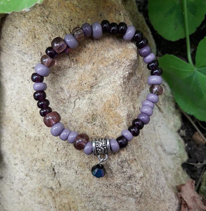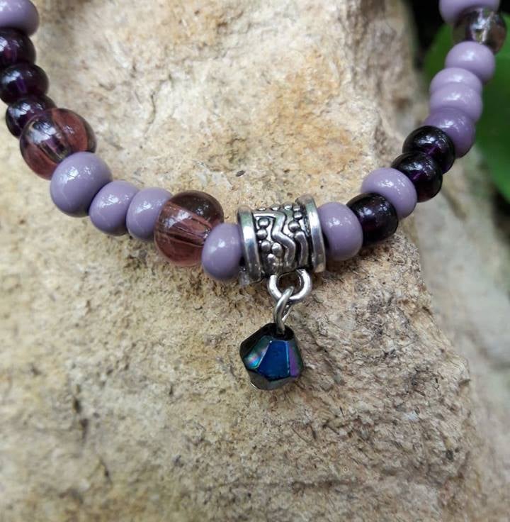 Handmade Bracelet using beaders elastic, so there is no need for a fastening. Made with a mixture of purple glass beads with a pretty crystal dangle charm.