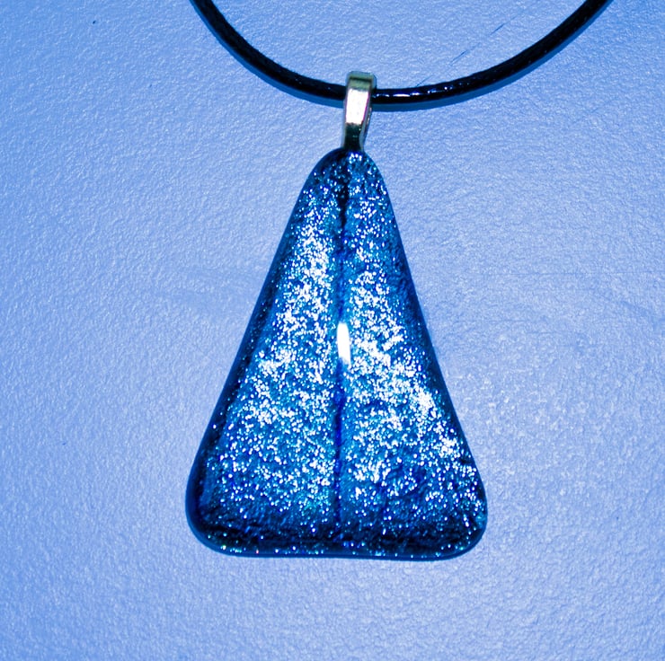 It is simply made from three pieces of hand-cut glass - two thin triangles of turquoise dichroic glass form the base which is capped with a single piece of clear glass. After a 12-hour session in the kiln, we attach a bail and thread the cord.