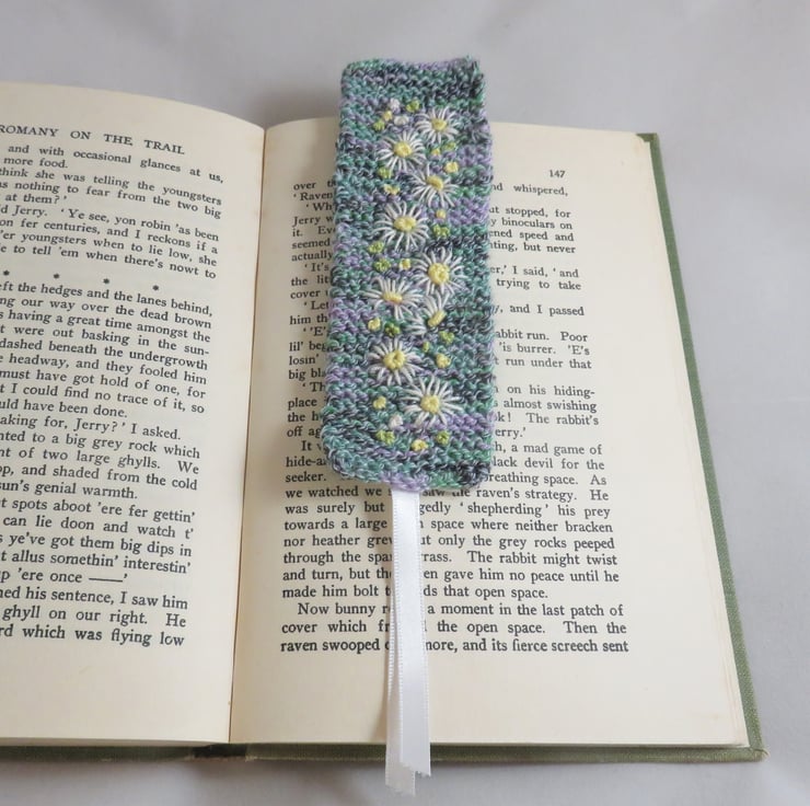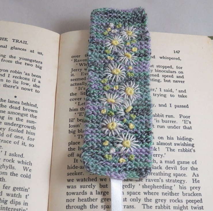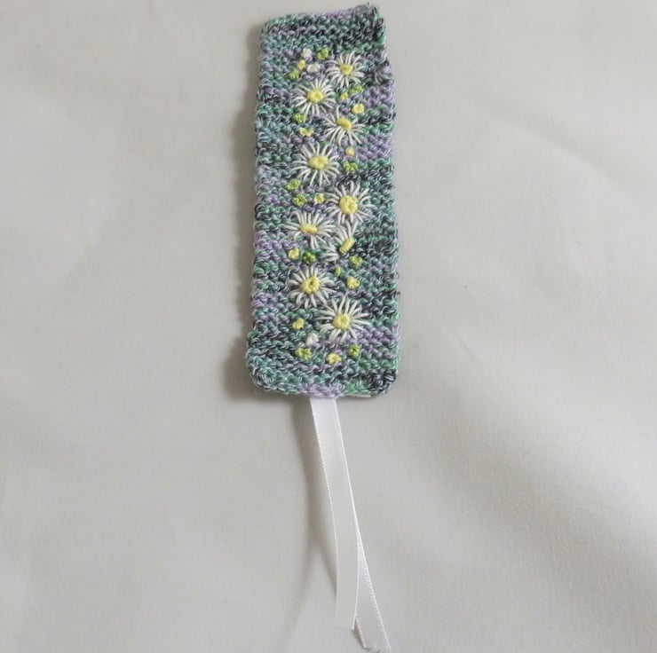 This pretty bookmark features hand embroidered daisies on a knitted background (using an oddment of leftover yarn), backed with a satin ribbon and trimmed with ribbon tails. Whilst the materials are not exactly recycled, they are all left over from other projects and deserved to be used.