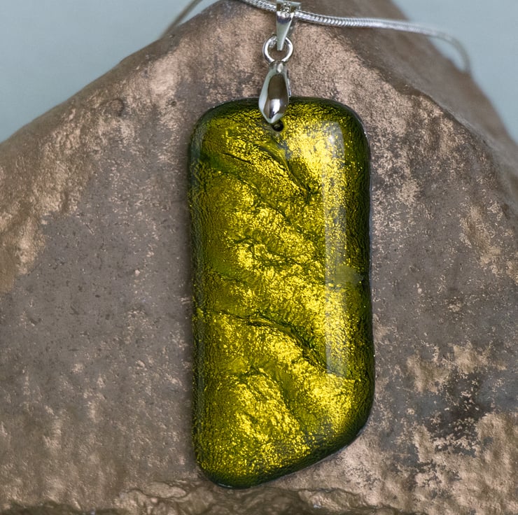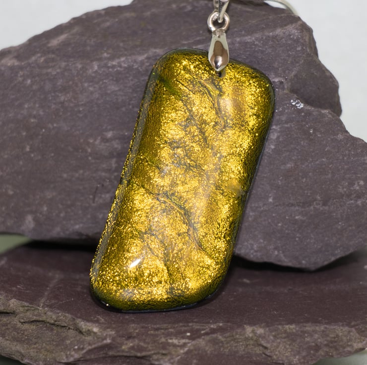 This is made very simply from a piece of textured silver dichroic glass covered with a piece of transparent gold-coloured glass. These have been fused together in the kiln and then the piece has been drilled to fit the bail.