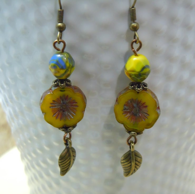 Earrings with Czech glass Picasso ochre pansy flower beads & Czech glass faceted marbled round beads with an antique bronze leaf charm, ear wires & bead caps also in antique bronze. A lovely gift for a boho loved one. Summery colours to cheer on a dull day!